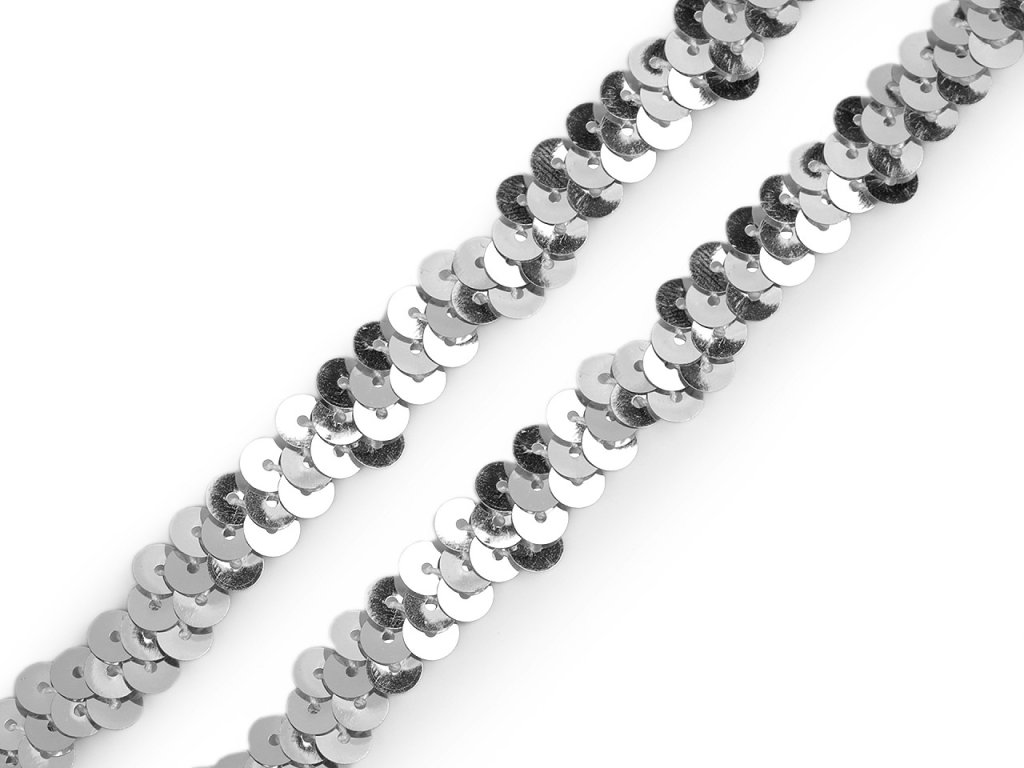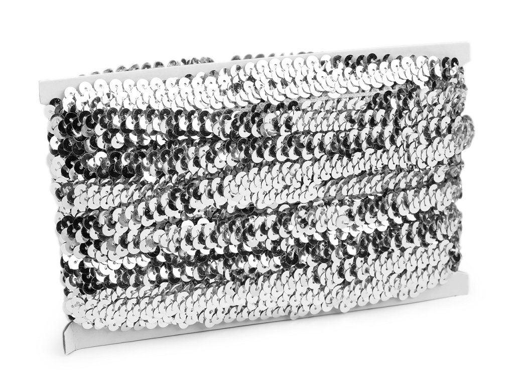 Elastický flitrový prýmek je velice efektní. Usnadní vám práci s jednotlivým našitím flitrů. Flitry jsou připevněné na tenkou pruženku cik cak způsobem. Působí, že jsou ve třech řadách. Po maximálním natažení pruženky se seřadí do jedné řady. Použití: Flitry využijete převážně jako ozdobu na plesové či společenské šaty, halenky nebo sukně. Hodí se jako praktický prvek na ozdobení tanečních a krasobruslařských trikotů.- Lesklé