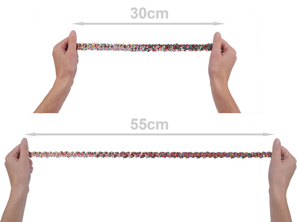 Elastický flitrový prýmek je velice efektní. Usnadní vám práci s jednotlivým našíváním flitrů. Flitry jsou připevněné na tenké pruženky cik - cak způsobem, působí bohatým dojmem. Po maximálním natažení pruženky se seřadí do dvou řad. Průměr flitrů je 6 mm. Použití: Flitry vyžijete převážně jako ozdobu na plesové či společenské šaty, halenky nebo sukně. Hodí se jako praktický prvek na ozdobení tanečních a krasobruslařských trikotů. S prýmkem si můžete vyrobit i originální čelenku do vlasů.- Šíře: 20 mm