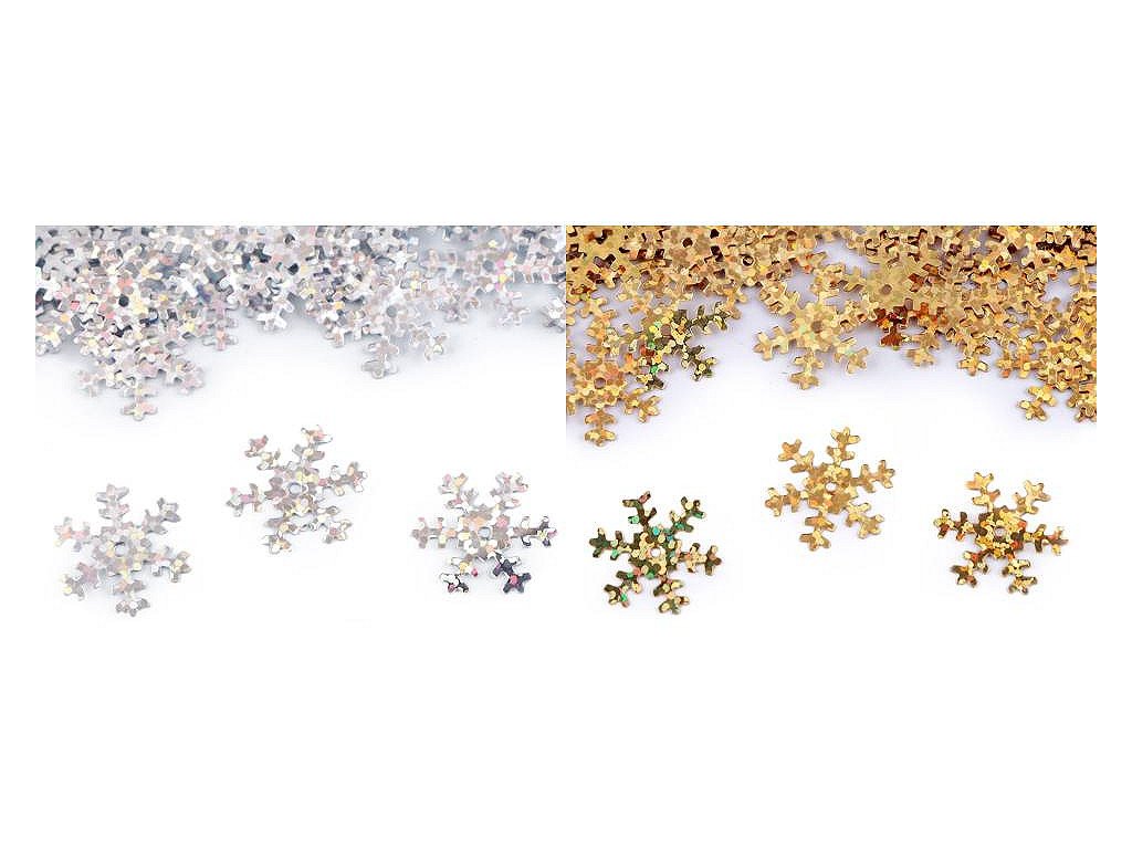 Hladké metalické flitry sněhové vločky. Vyniknou především u vánočních dekorací. Uprostřed mají otvor, jsou vhodné i na našití na oděvy a módní doplňky. Flitry s označením hologram se nádherně třpytí. Použití: Flitry využijete v technice scrapbooking na zdobení foto rámečků, alb, přáníček, pozvánek, krabiček apod. Jsou vhodné také jako ozdoba na adventní věnce, dárky apod. Nasypané na stole budou působivou ozdobou svátečního prostřeného stolu. V 10 g balení je cca 210 kusů vloček.- Průměr: 19 mm