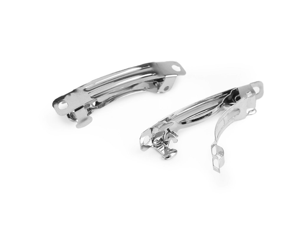 Malá francouzská sponka je vyrobená z kvalitního bižuterního kovu, ve vlasech pevně drží. Je určená k dalšímu zdobení. Obvykle se zdobí různými korálky, které se navlékají na tenký drátek . Ten se pak omotává o svrchní část spony, čímž se vytváří celkový vzhled podle vlastních představ. Na sponku můžete také nalepit květy a různé další ozdoby. Horní strana má na každém konci dírku s vnitřním průměrem 2 mm k uchycení ozdoby. Délka části pro vlasy je 2 cm.- Šířka: 6 mm