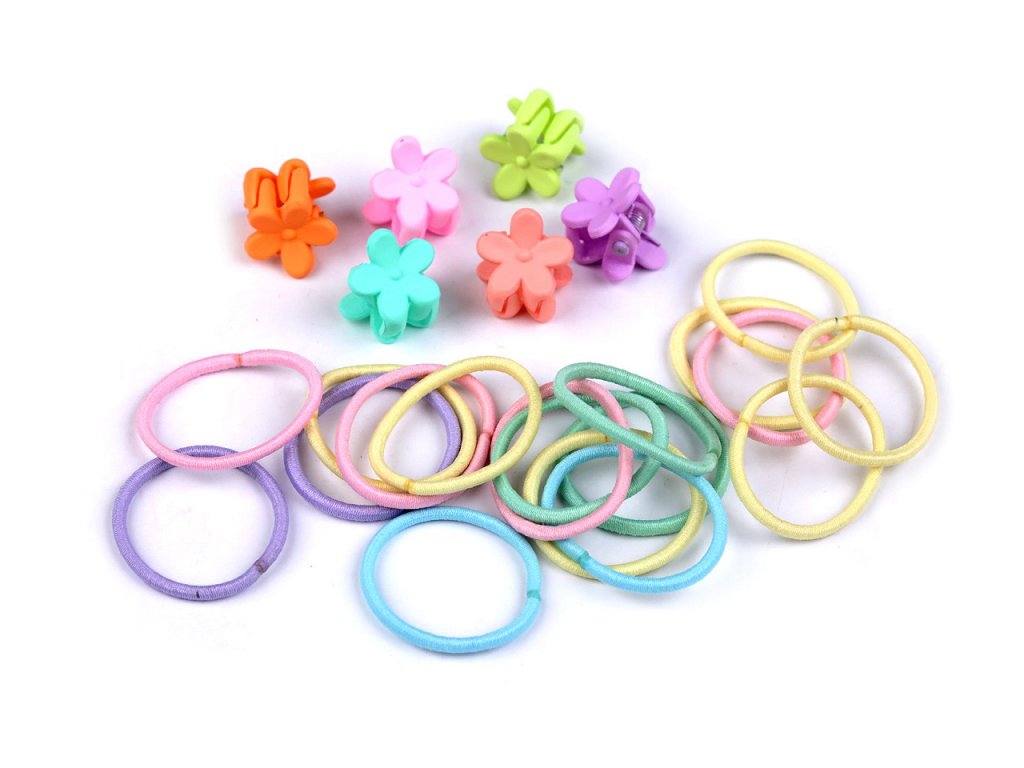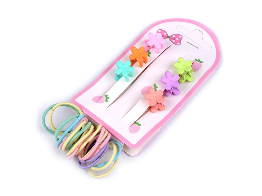 Sada malých skřipců do vlasů a gumiček je ideální pro holčičky, které rády vytvářejí zajímavé účesy. Dívky si mohou se skřipečky sepnout malé pramínky jemných dětských vlásků. Sada obsahuje 6 skřipců a 18 gumiček. Jsou připevněny na papírové kartě, kterou lze zavěsit.- Rozměry: 6 x 14,5 cm