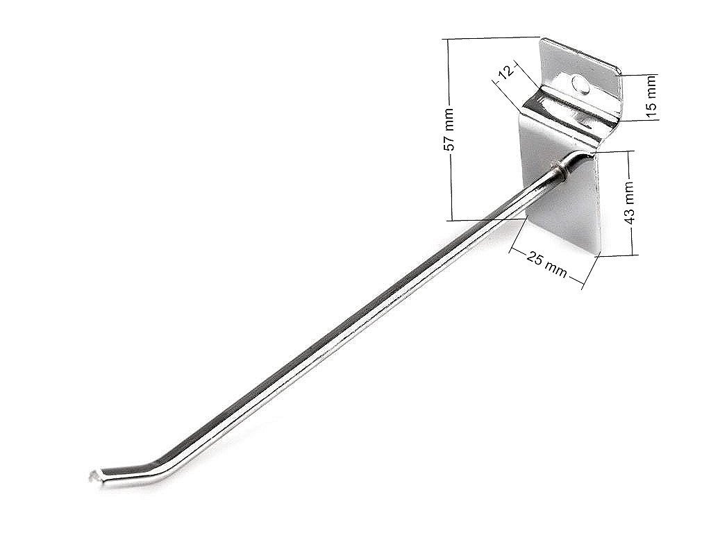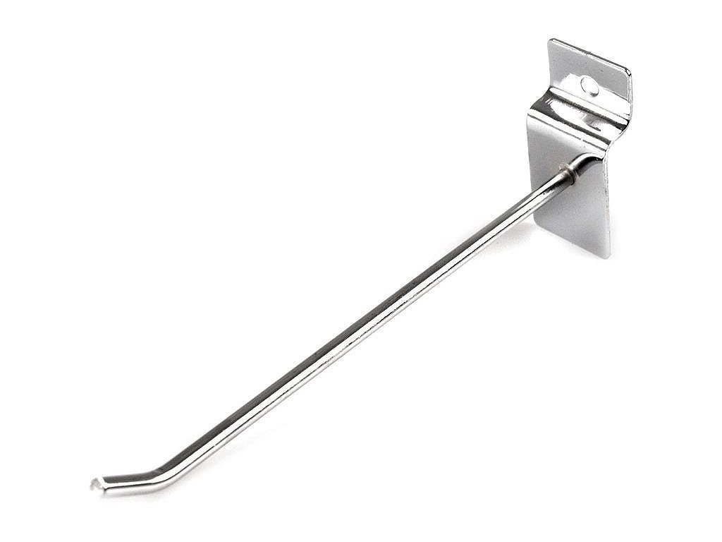 Kovový háček je vhodný pro panely, stojany či skříně s kovovými drážkami.Rozměry viz foto.- Délka: 14 cm