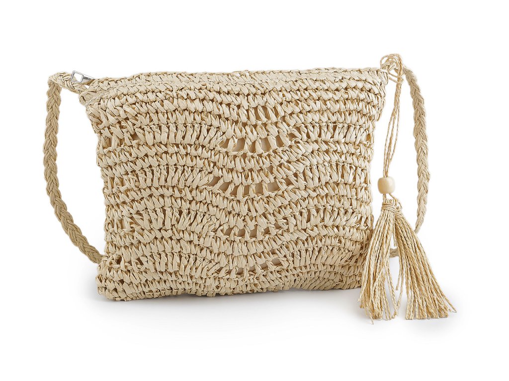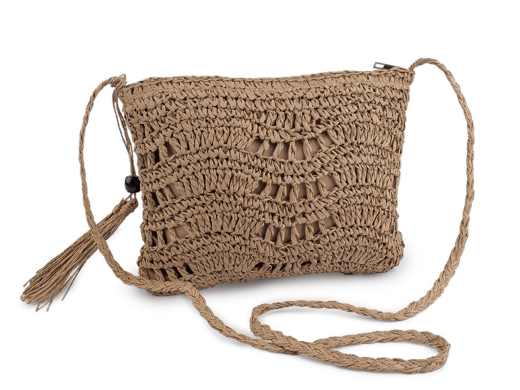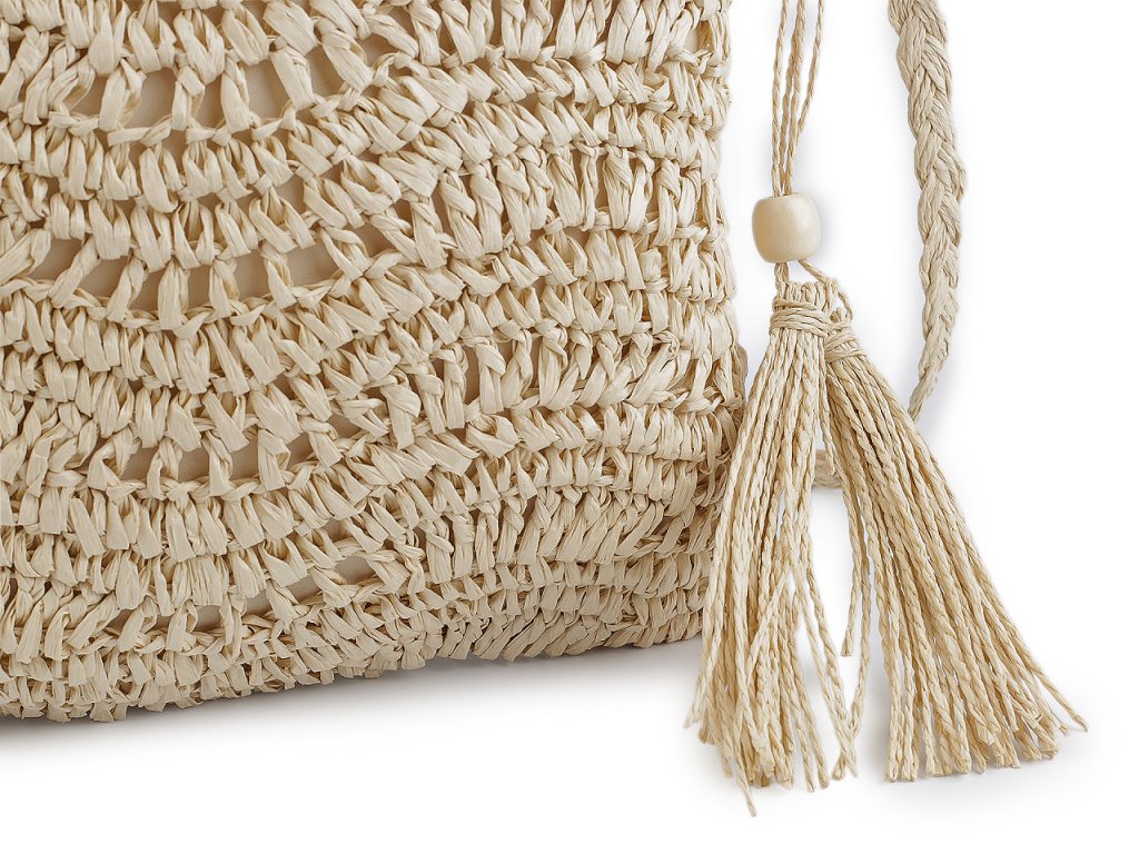 Háčkovaná kabelka s dvojitým střapcem s dřevěným korálkem je zajímavým módním doplňkem v boho stylu. Je vyrobená z papírových provázků z palmy rafie, díky tomu je lehká jako peříčko. Decentní vzor háčkování vytváří nadčasový vzhled, který se hodí k různým příležitostem, bude krásným doplňkem vašeho letního outfitu. Zavírá se na zip, uvnitř má podšívku s malou kapsou na drobnosti. Součástí kabelky je spletený popruh, kabelku můžete nosit jako crossbody přes rameno či do kříže.- Rozměry (ŠxVxH): 27 x 23 x 2 cm