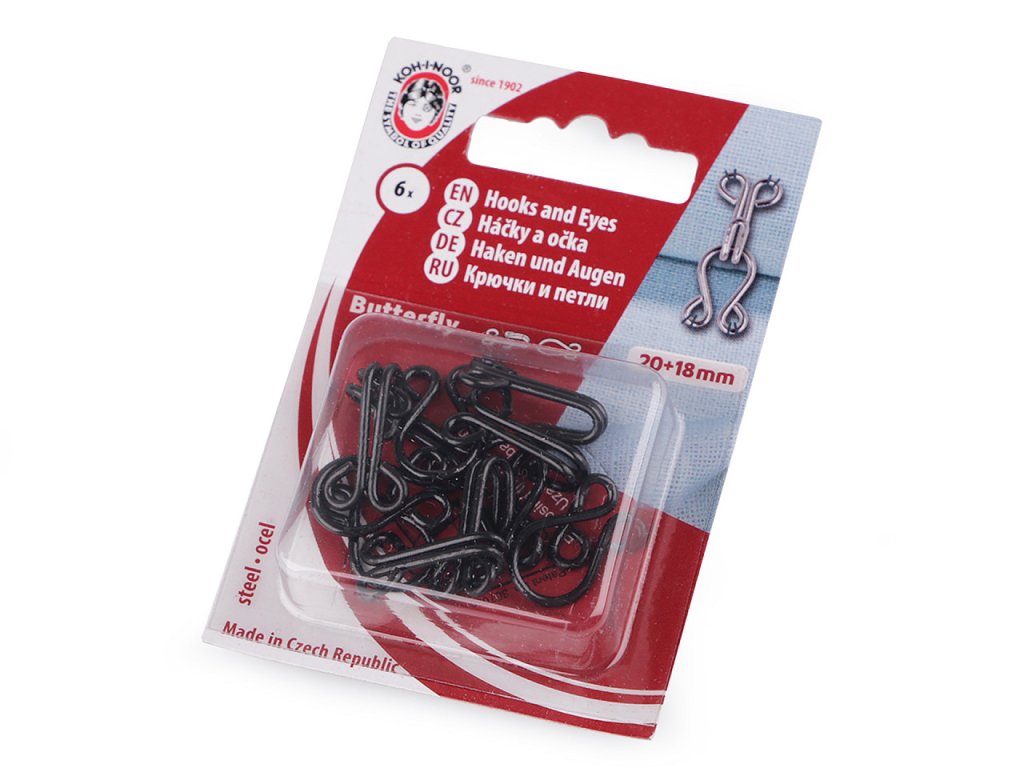 Zapínání na háček a očko je vyrobeno z magnetizujícího kovu. Používá se na oděvy a připevňuje se přišitím. V balení je 6 párů. Velikost 16+18 mm: délka očka 16 mm, délka háčku 18 mm Velikost 18+20 mm: délka očka 18 mm, délka háčku 20 mm- Velikost: 18+16; 20+18 mm