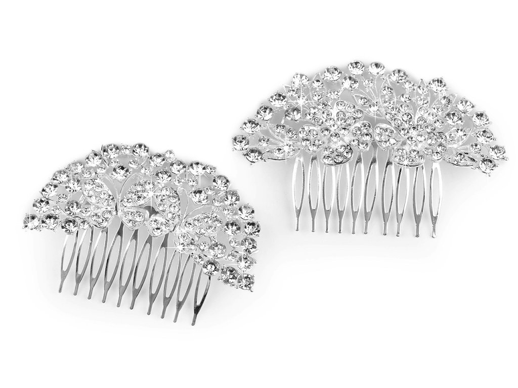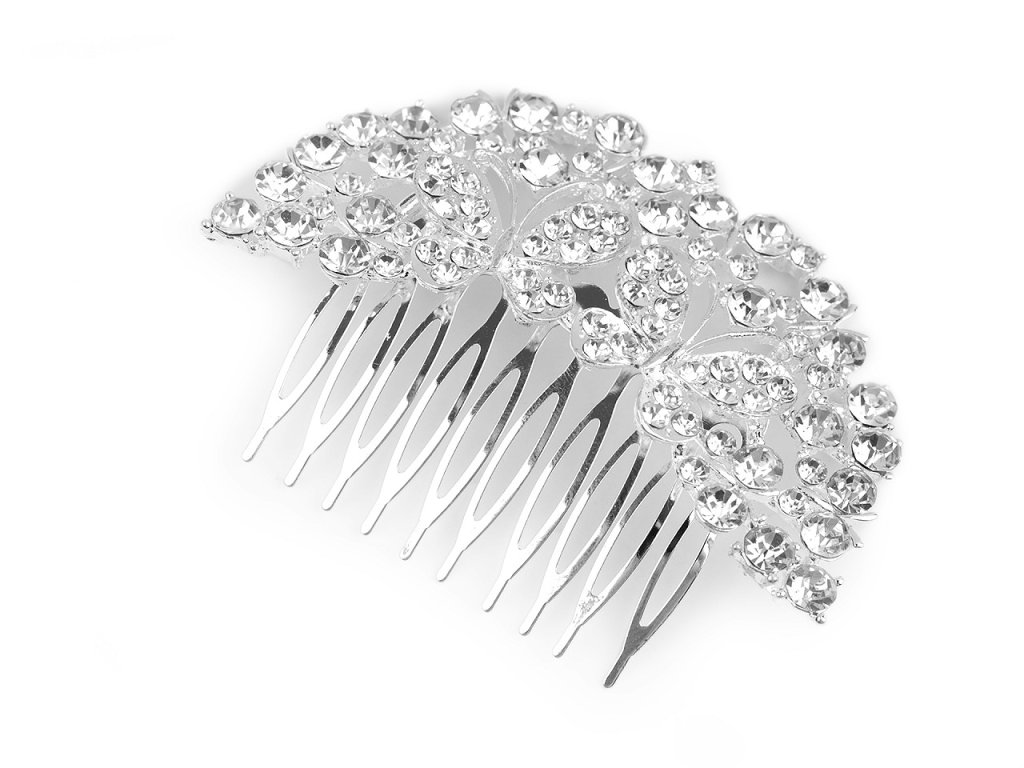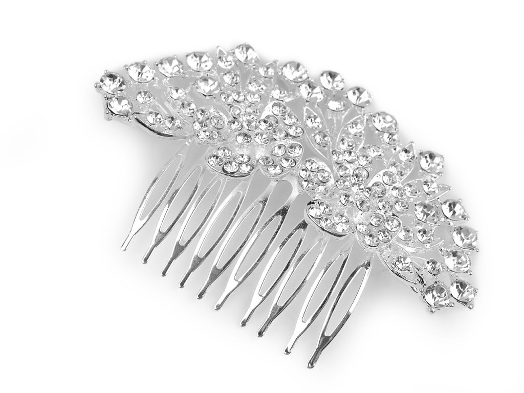 Kovovým hřebenem do vlasů ozdobeným broušenými kamínky oslníte na každé slavnostní události, protože se třpytí už z velké dálky. Je vhodný do společenských účesů i pro nevěsty v jejich den. Samotný hřeben je rovný, ozdoba je jemně prohnutá. V účesu hřeben pevně drží.- Šířka: 4 cm