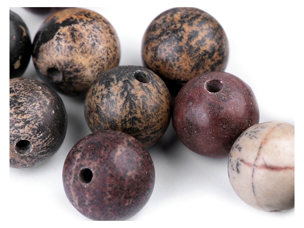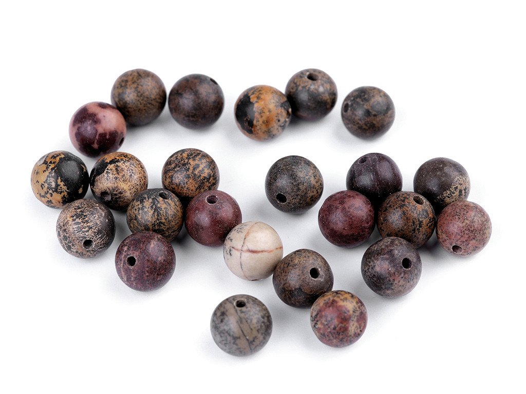 Minerální korálky z tmavého jaspisu jsou oblíbené především šperkaři pro své zemité barvy a kresbu. Svou velikostí jsou ideální na výrobu Buddhových náramků. Jsou oblíbené na techniku drátování, v kombinaci s drahými kovy, ale i s obyčejnými drátky. Skvěle vypadají i na jednoduchých návlekových šňůrách, které zajímavě ozvláštní.- Průměr: 8 mm