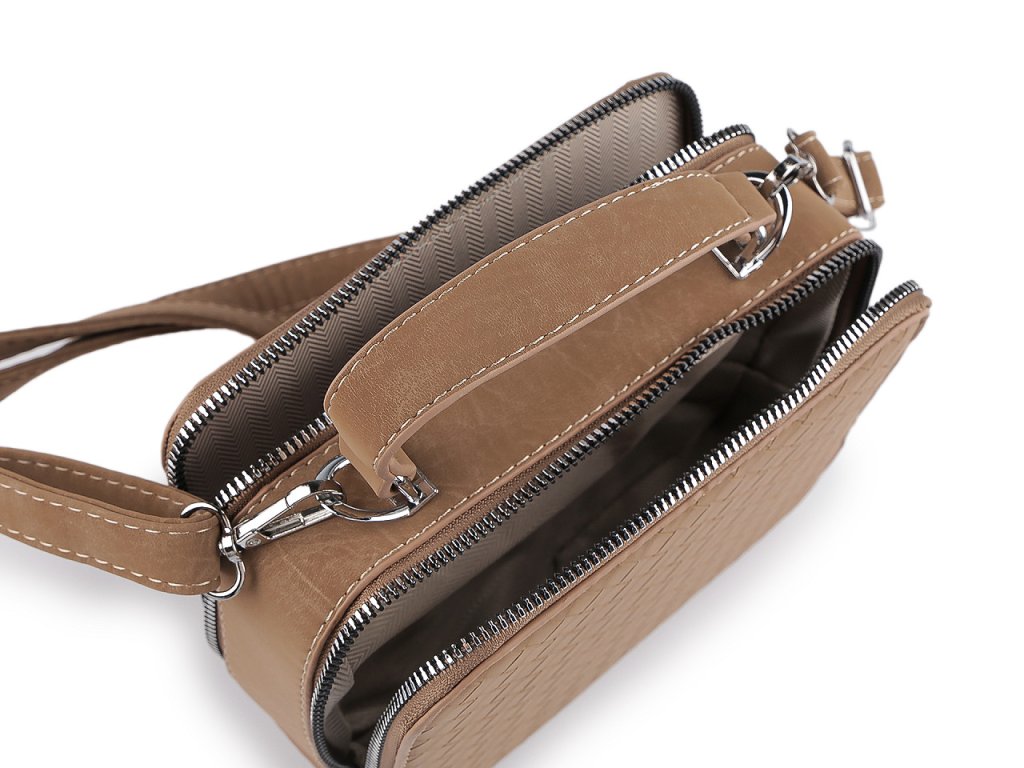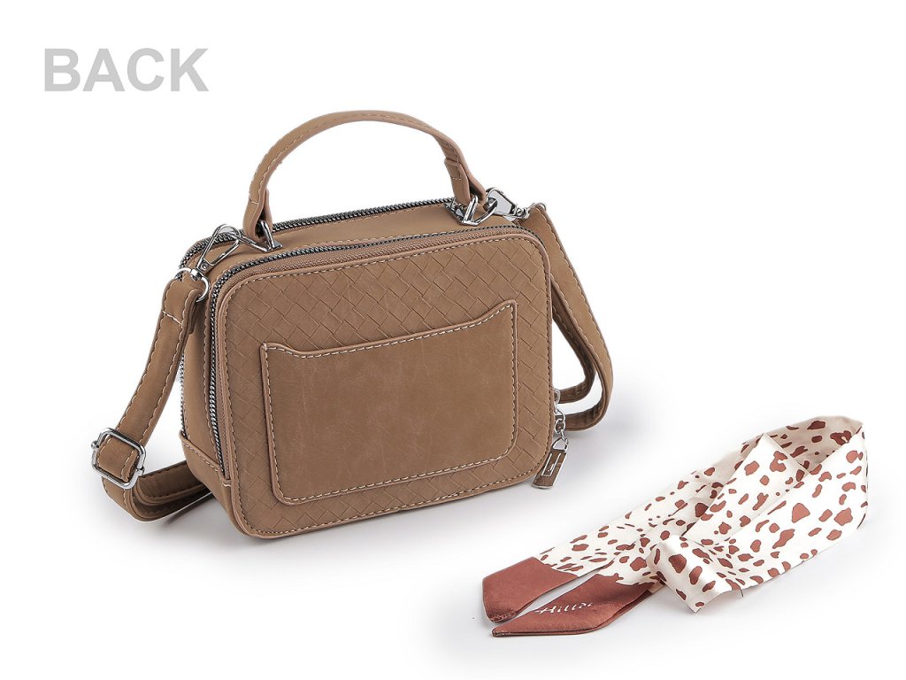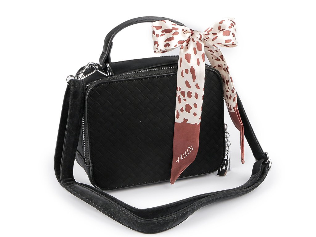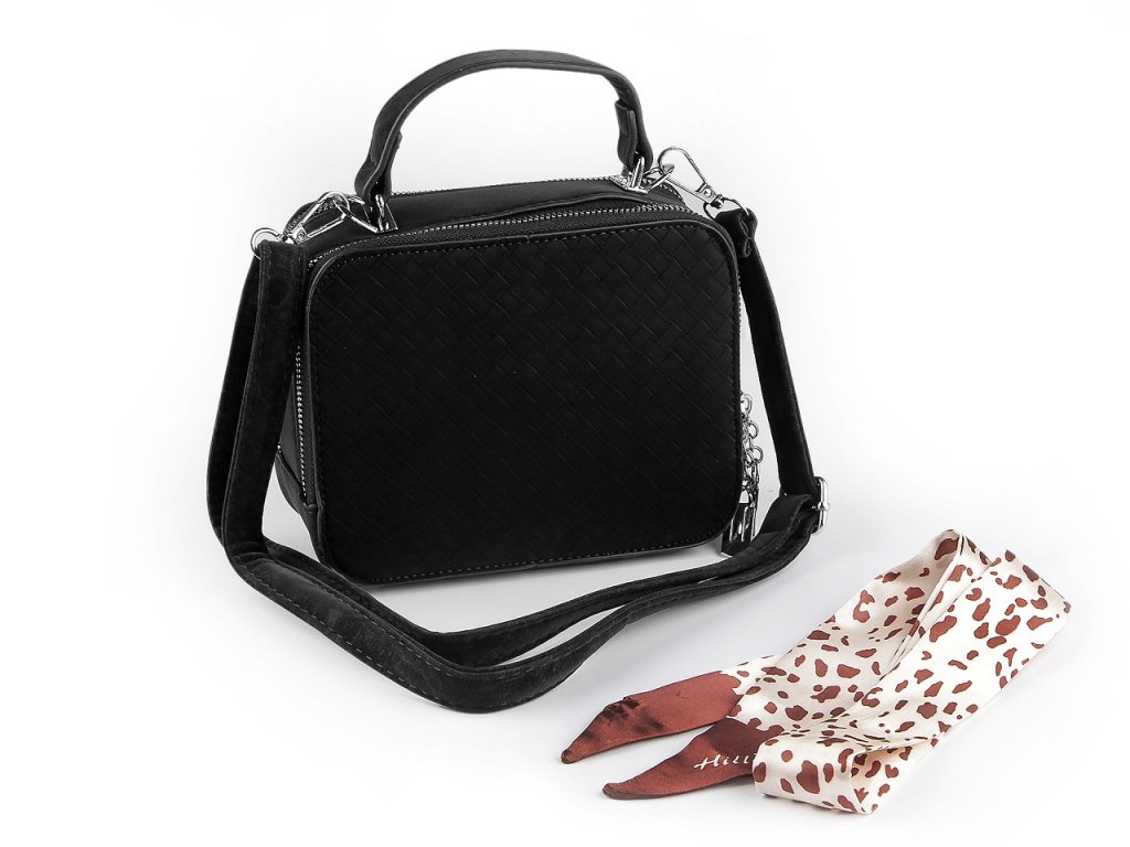 Malá módní kabelka se saténovým šátkem se díky svému elegantnímu vzhledu stane skvělou společnicí. Má příjemný semišový povrch, šátek jí přidává na šarmu a jedinečnosti, můžete si jej ovázat i kolem krku nebo zápěstí, hodí se i jako čelenka do vlasů. Z kabelky se dá šátek odvázat. Kabelka má dvě oddělené kapsy uzavíratelné na zip. V jedné z nich je i malá vnitřní kapsa, která slouží k uschování drobných cenností. Na zadní straně je ještě malá plochá kapsa. Součástí kabelky je ucho do ruky a odnímatelný popruh na karabiny s plynulou regulací délky. Kabelku můžete nosit jako crossbody přes rameno či do kříže. Rozměry saténového šátku: 3,7 x 84 cm, oboustranný.- Rozměry (ŠxVxH): 19 x 15 x 8 cm