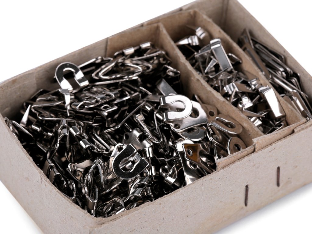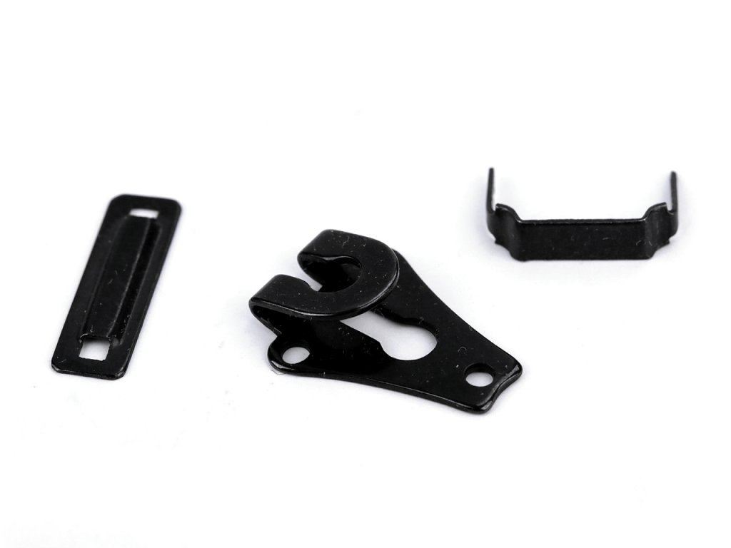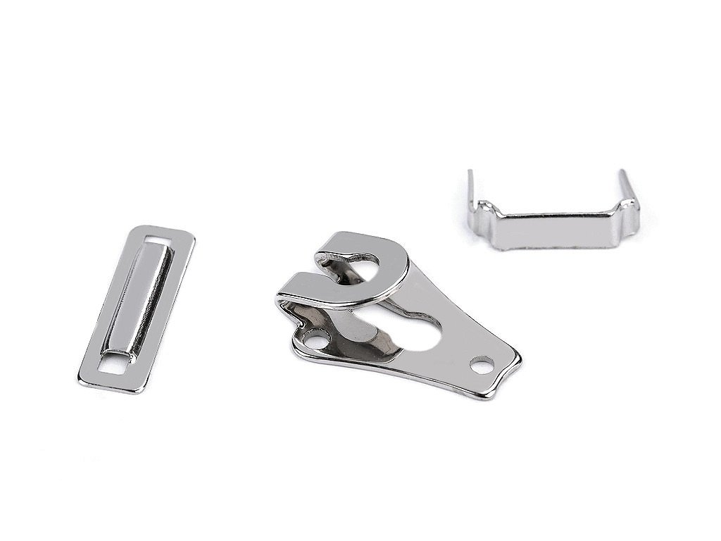 Kovový háček se skládá ze tří částí. Používá se jako zapínání u oděvních výrobků, například pánských a dámských kalhot nebo sukní. Kov, ze kterého je háček vyrobený, je pratelný.- Rozměry celkem: 19 x 21 mm