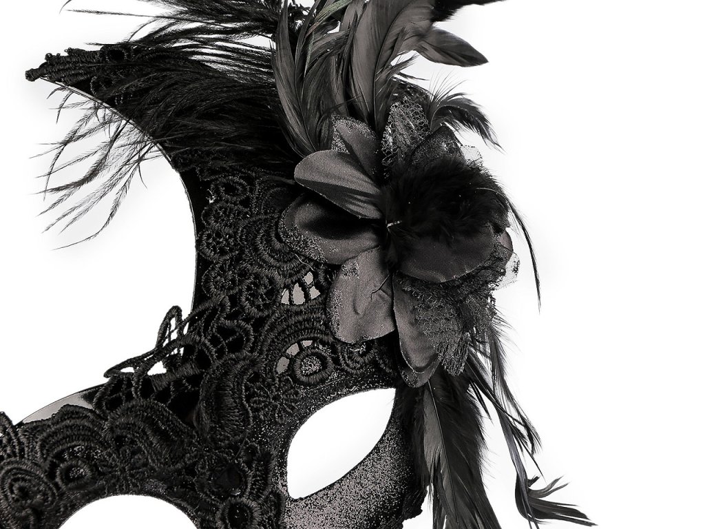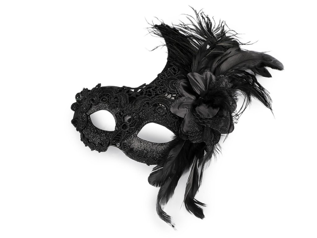 Karnevalová škraboška vám dodá tajemný a svůdný vzhled. Využijete ji na různé večírky, plesy, párty, karnevaly apod. Škraboška je celá pokrytá třpytivými glitry a doplněná elegantní krajkou. Její prodloužený bok zdobí textilní květ a peří. Na obličeji perfektně drží díky pružence.- Šířka: 16 cm