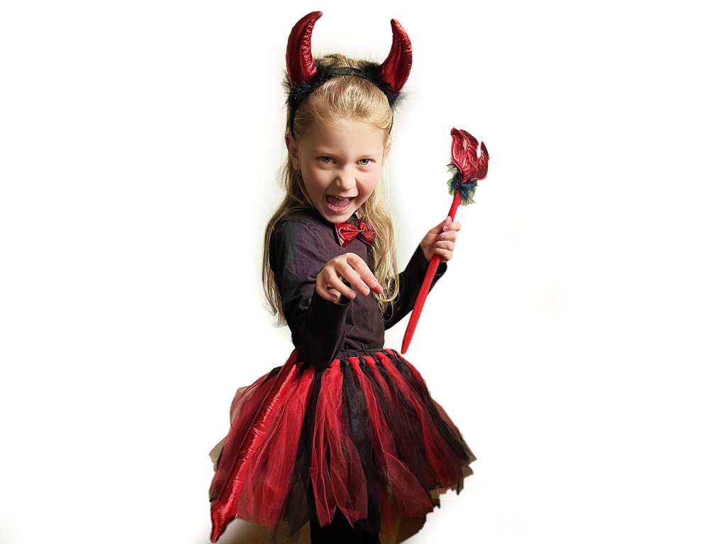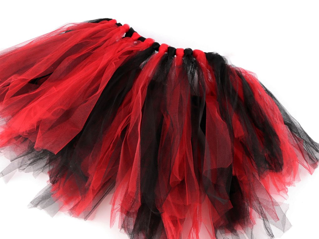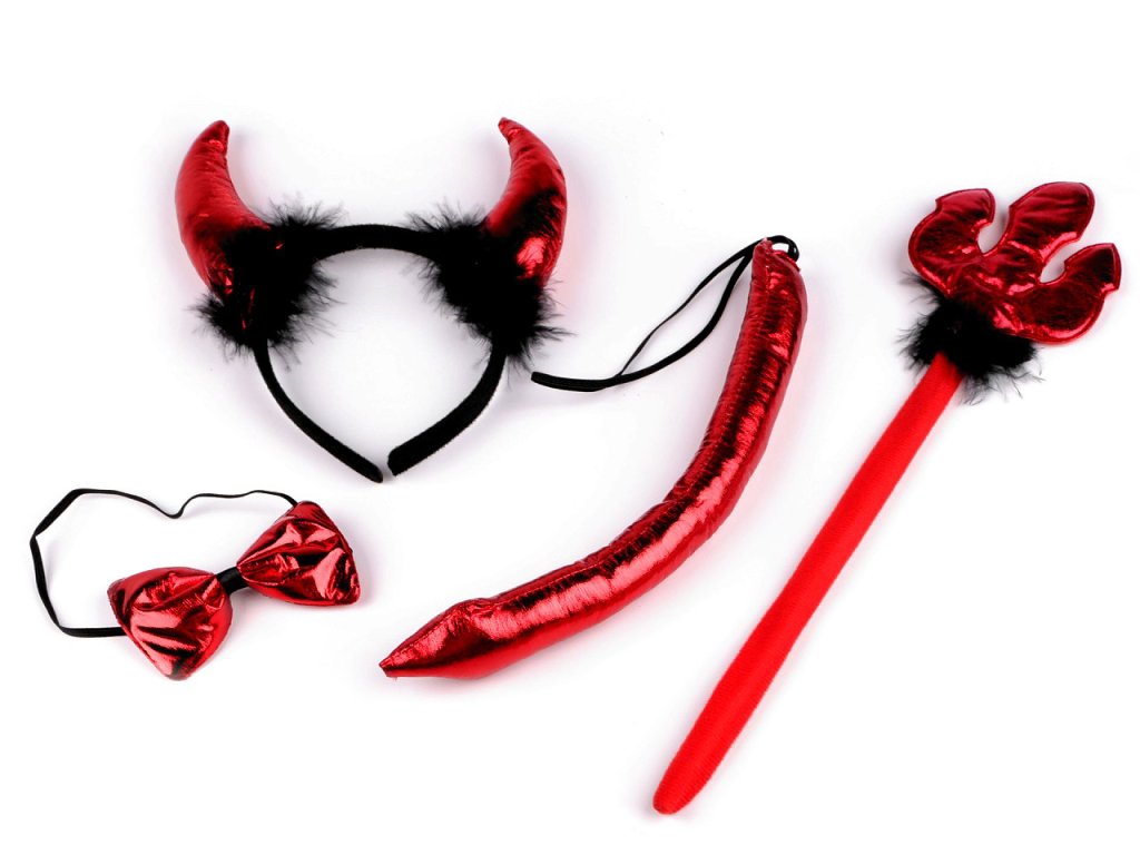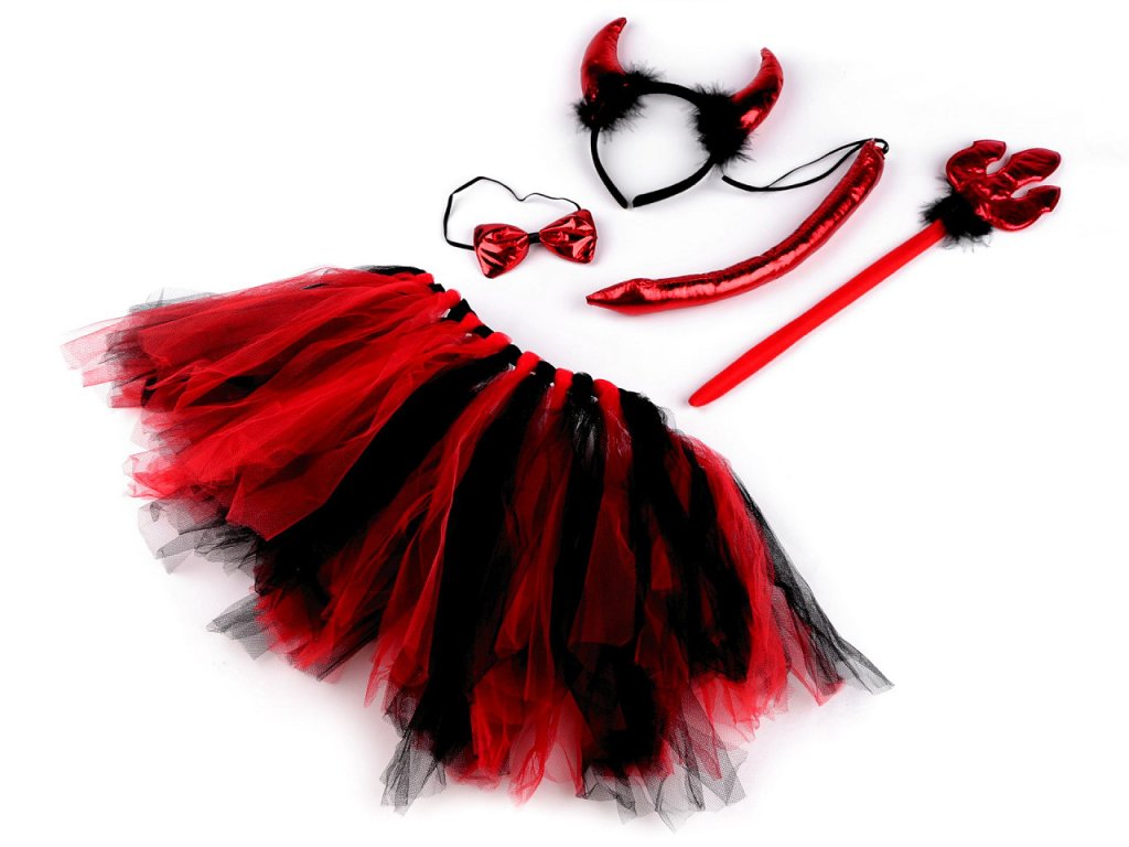 S karnevalovým kostýmem proměníte svou malou holčičku v čertici. Kostým obsahuje tylovou sukýnku, ocas, vidle, motýlka na krk a čelenku. Sukýnka je v pase je pružná. Délka sukně je cca 28 cm. Obvod je cca 50 - 80 cm. Délka ocasu je 32 cm. Délka vidlí je 41 cm. Rozměry motýlka jsou 5 x 10 cm. Obvod čelenky je 34 cm. Výška rohů je 9 cm.- Sada: 5 ks