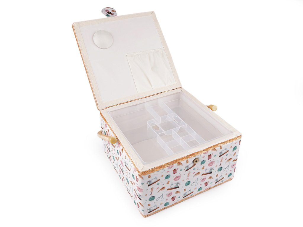 Větší čalouněný košík na šicí potřeby ocení všechny švadleny. Na vnitřní straně víka má košík jehelníček a kapsu. Dále je k dispozici plastové mezipatro se spoustou přihrádek, do kterých si lze šicí potřeby uspořádat. Patro se dá snadno vyjmout. Výška mezipatra je 3 cm. Košík má zapínání na magnet. Díky kvalitnímu pevnému uchu jej můžete snadno přenést.- Rozměry: 28 x 28 cm