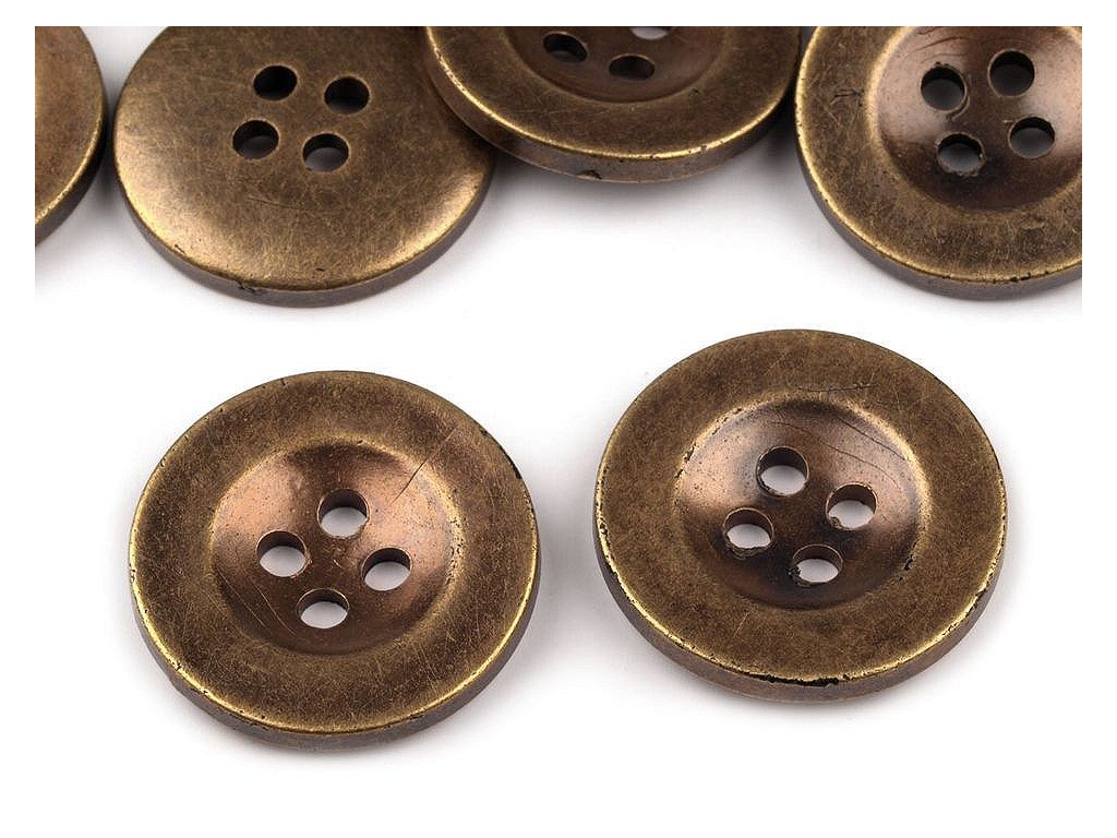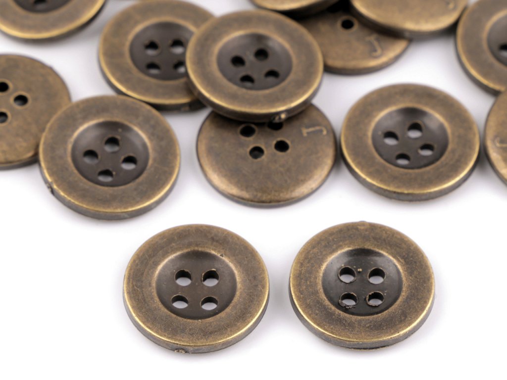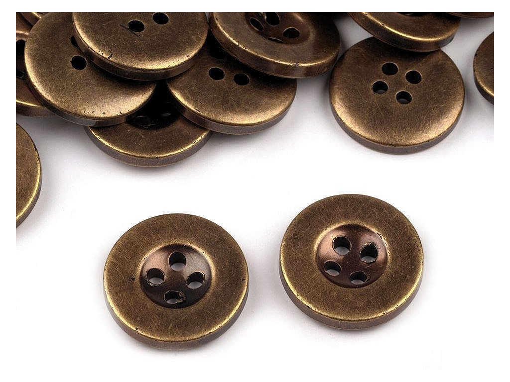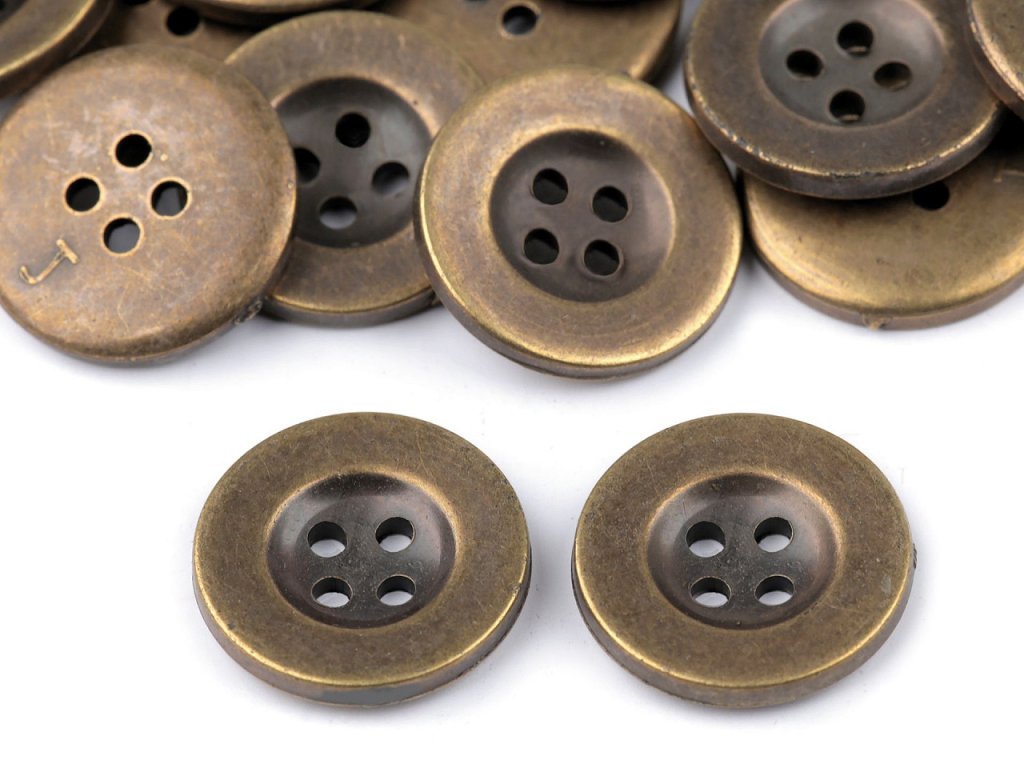 Čtyřdírkové hladké knoflíky jsou vyrobené z plastu. Jejich povrch má staromosaznou barvu, která věrně imituje kov. Knoflíky můžete našít na oděvy, například košile, saka, svetry, bundy apod. Knoflíky jsou baleny v sáčku. Velikost knoflíků naleznete v této tabulce.- Průměr: 15; 21 mm