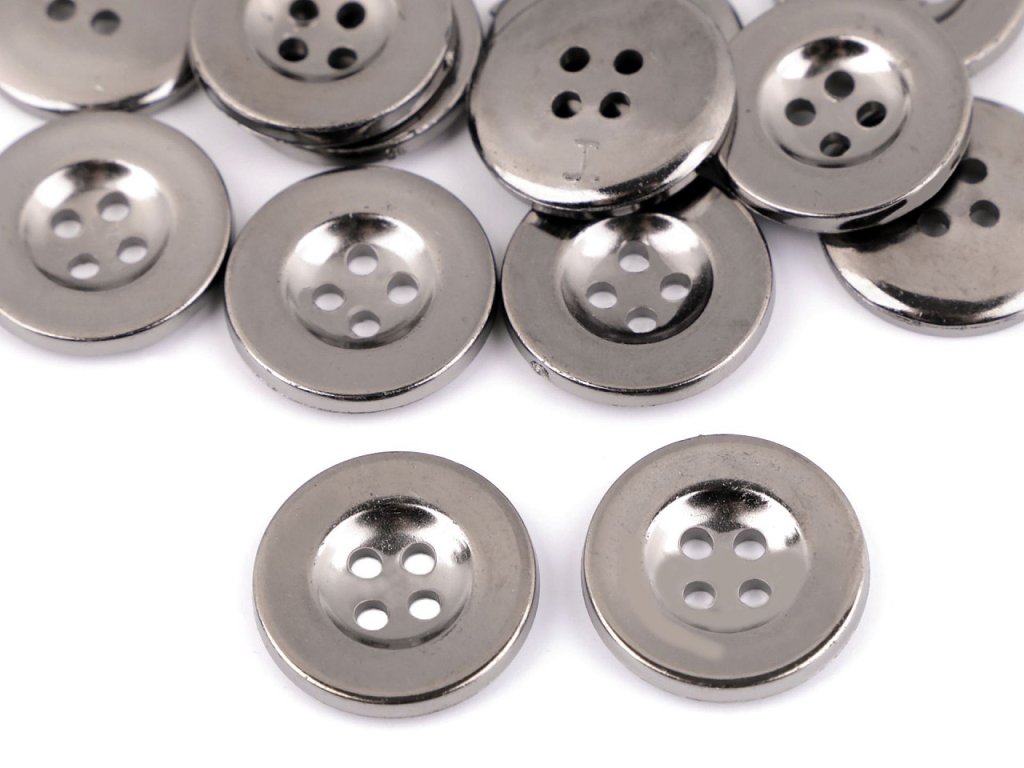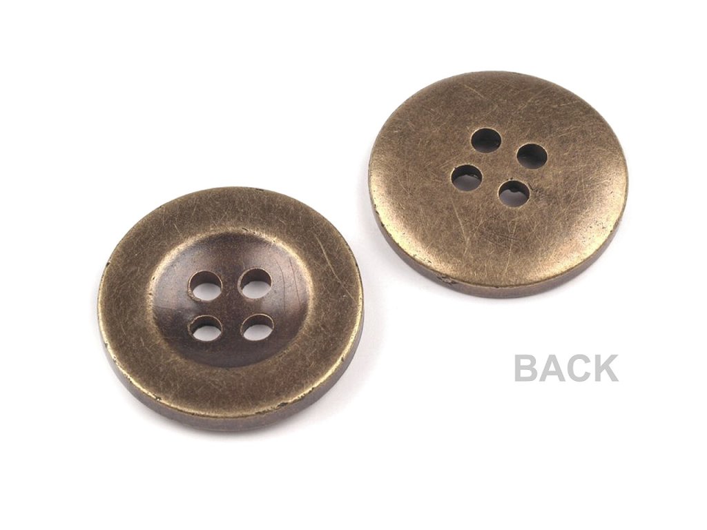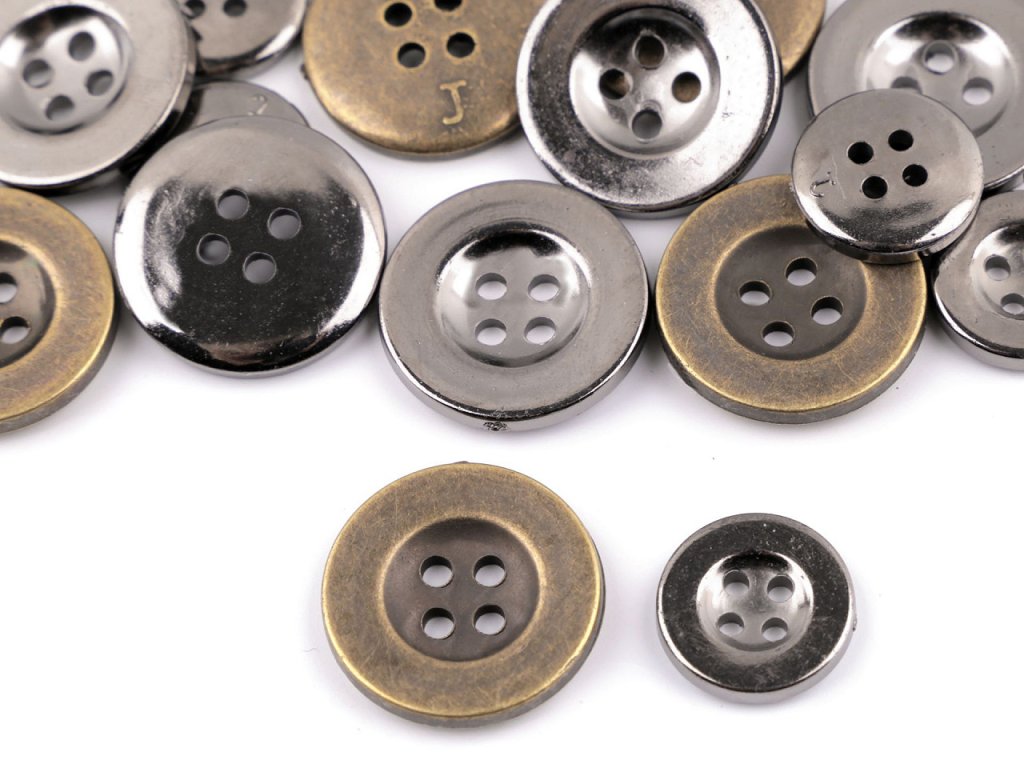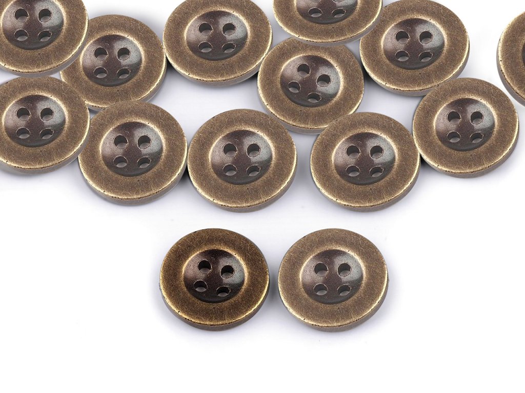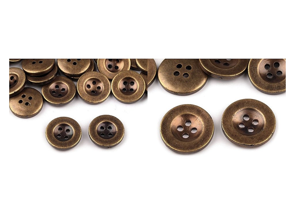 Čtyřdírkové hladké knoflíky jsou vyrobené z plastu. Jejich povrch má staromosaznou barvu, která věrně imituje kov. Knoflíky můžete našít na oděvy, například košile, saka, svetry, bundy apod. Knoflíky jsou baleny v sáčku. Velikost knoflíků naleznete v této tabulce.- Průměr: 15; 21 mm