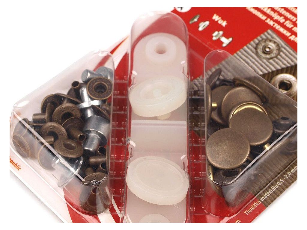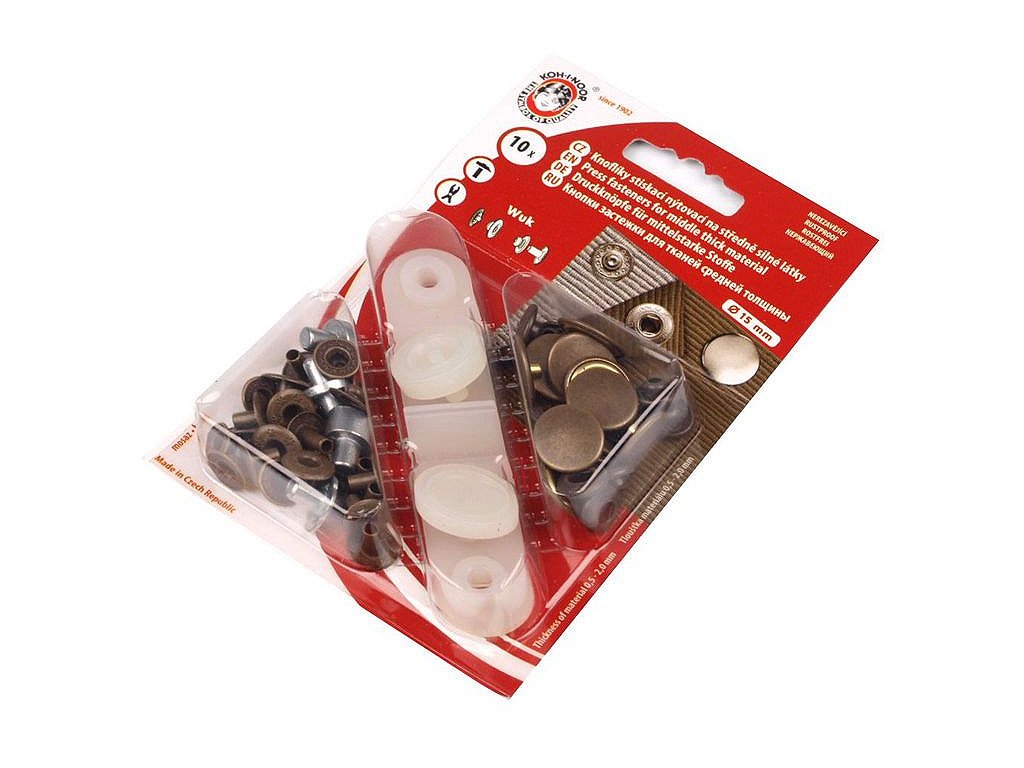 Stiskací nerezavějící knoflíky jsou určeny ke spojování středně silných látek o tloušťce 0,5 - 1,5 mm. Nýtování se provádí plastovým mini lisem, který je součástí balení.- Průměr: 15 mm