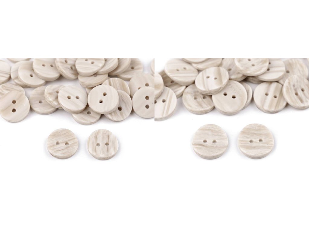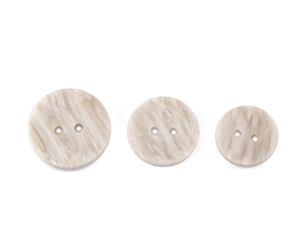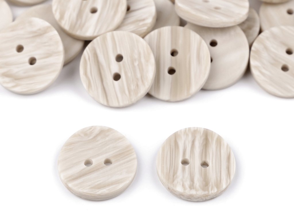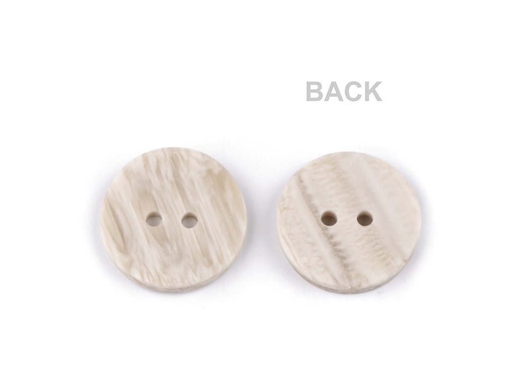 Dvoudírkové knoflíky mají zajímavý design - z rubové strany jsou rovné, z lícové strany jsou lehce vypouklé směrem dovnitř. Zabarvením imitují světlé dřevo. Vyniknou na svetrech, vestách, sakách, bundách apod. Velikost knoflíků naleznete v této tabulce.- Průměr: 15,5 mm