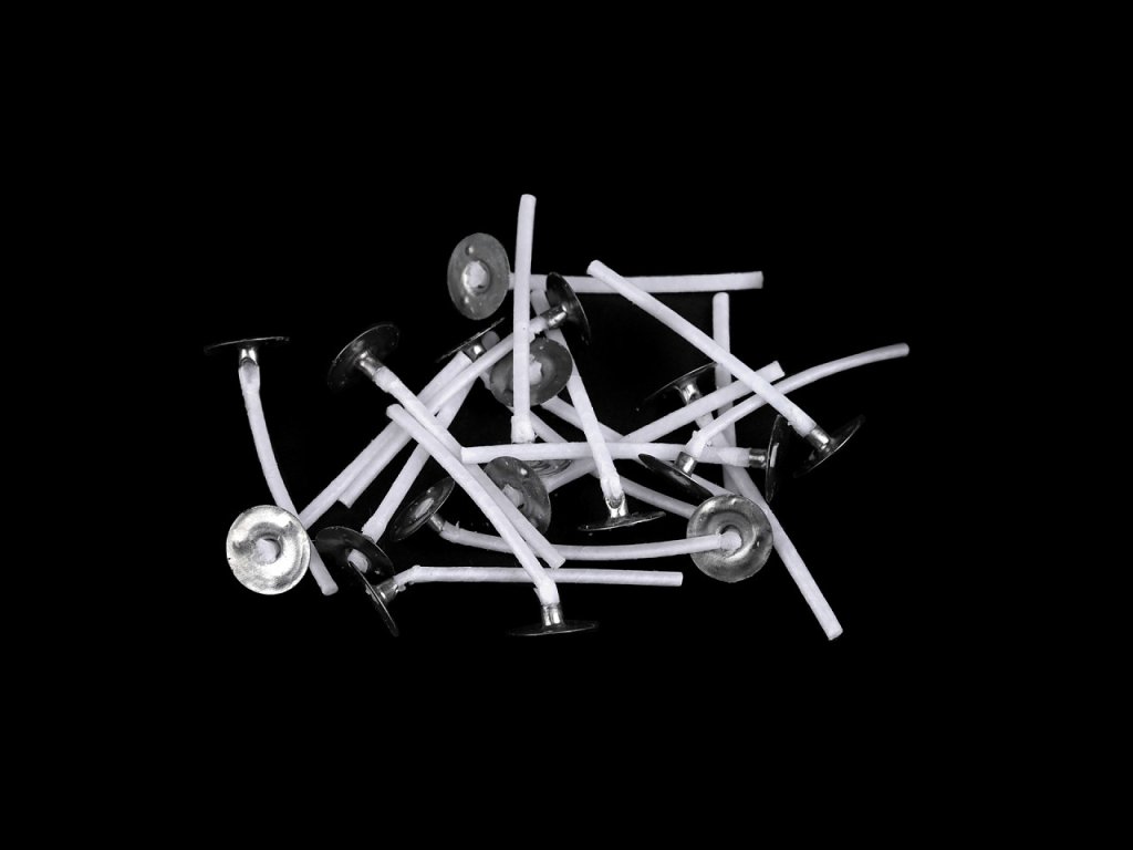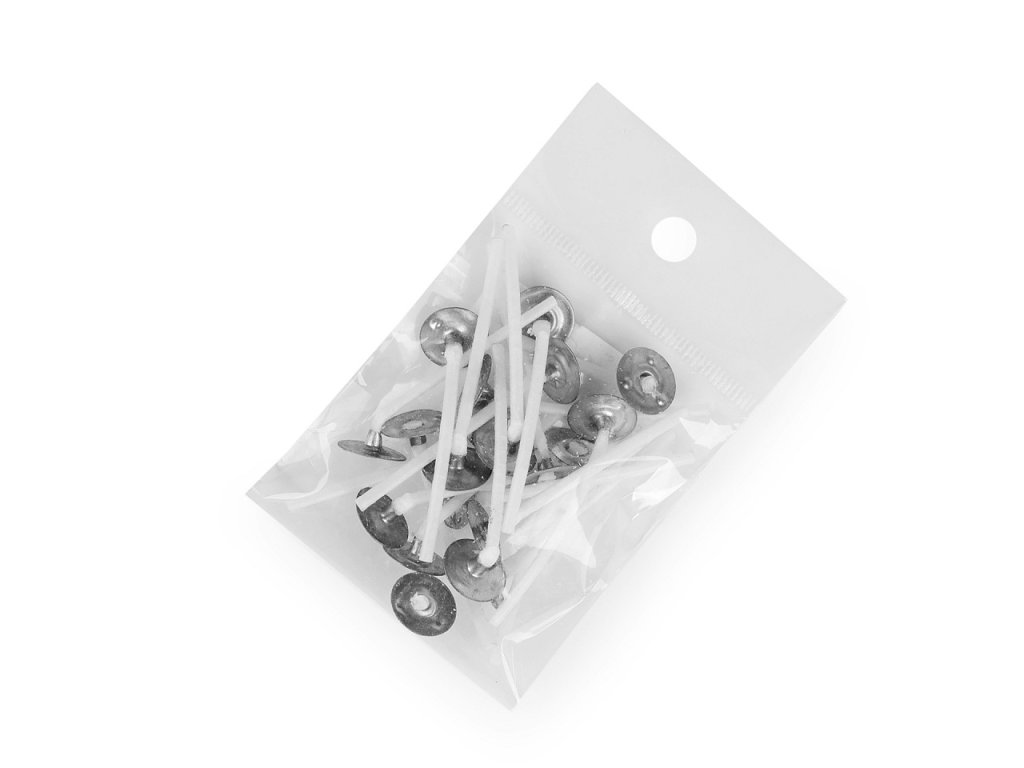 Knoty s plíškem využijete na výrobu menších svíček. Jsou bavlněné a potažené rostlinným voskem. Šířka ukotvovacího plíšku je 12 mm.- Délka: 4,3 cm
