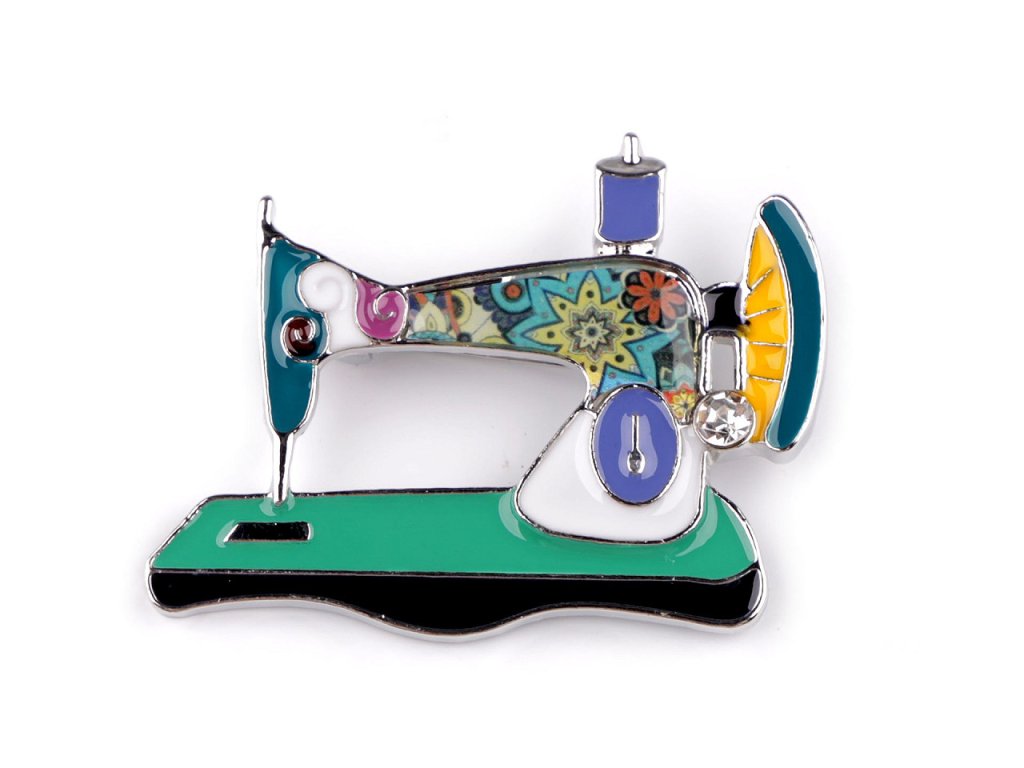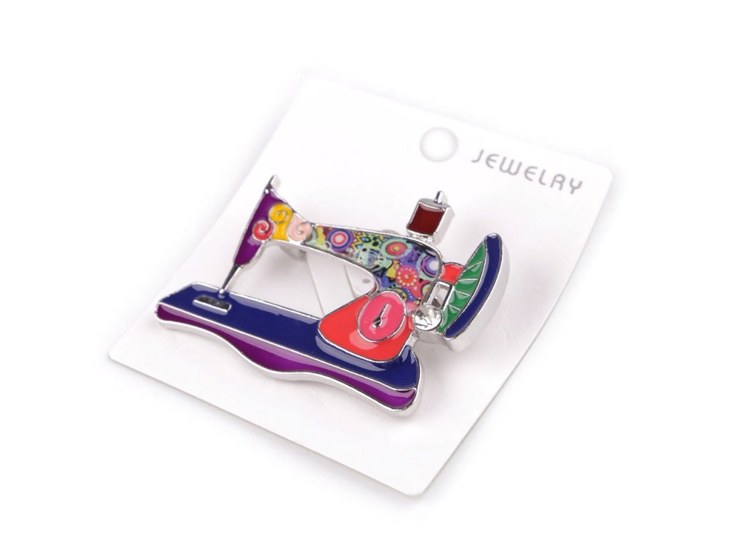 Smaltovaná brož šicího stroje bude skvělým dárkem nejen pro švadlenku. Ocení ji všechny kreativní ženy, které milují barvy. Je ozdobená broušeným kamínkem. Z rubu má brožový špendlík. Můžete ji nosit nejen na oděvech, hodí se i k ozdobení klobouků, tašky či sepnutí šátku. Brož je na plastové kartě, kterou lze zavěsit na prodejní stojany.- Rozměry: 4 x 5,4 cm