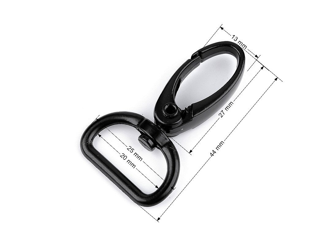 Černou kovovou karabinku využijete na upevnění popruhů k taškám a kabelkám i na výrobu vodítek pro mazlíčky. Je otočná. Karabina je z nemagnetického kovu, magnetický je pouze šroubek uprostřed.- Rozměry celkem: 25 x 44 mm