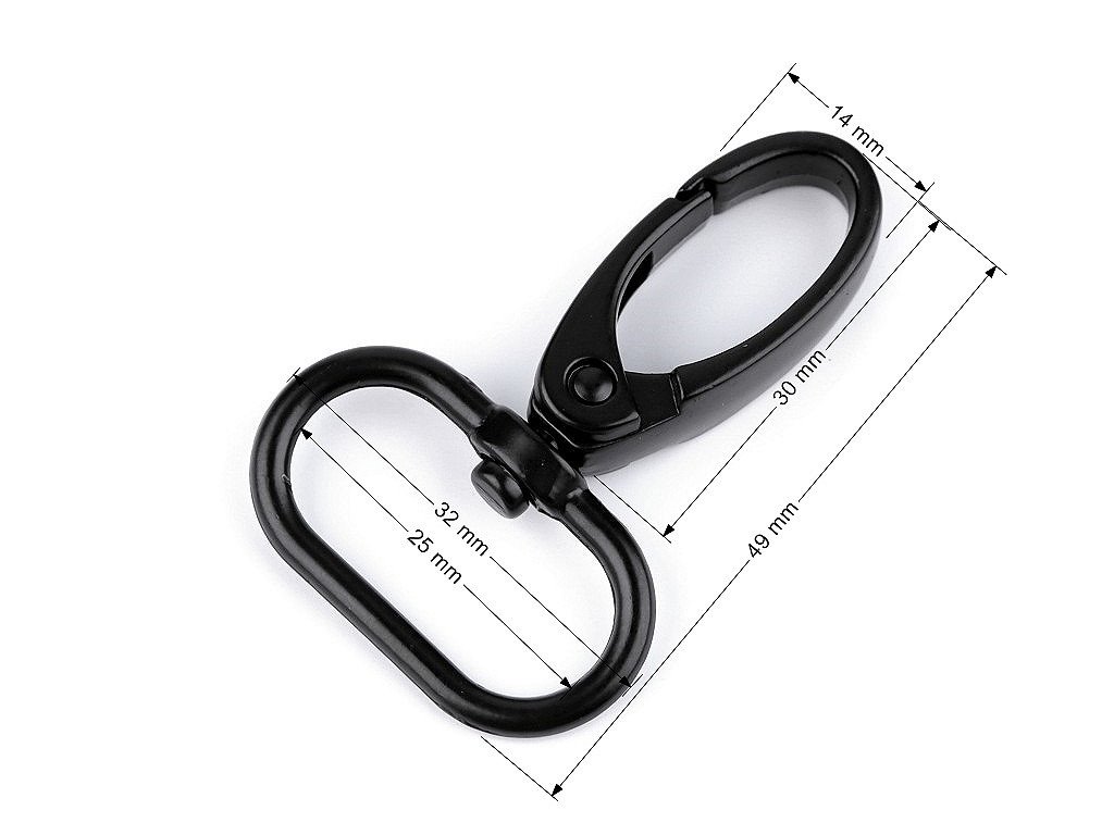 Černá kovová karabina je vhodná na upevnění popruhů k taškám a kabelkám i na výrobu vodítek pro psy. Je otočná. Karabina je z nemagnetického kovu, magnetický je pouze šroubek uprostřed.- Rozměry celkem: 32 x 49 mm