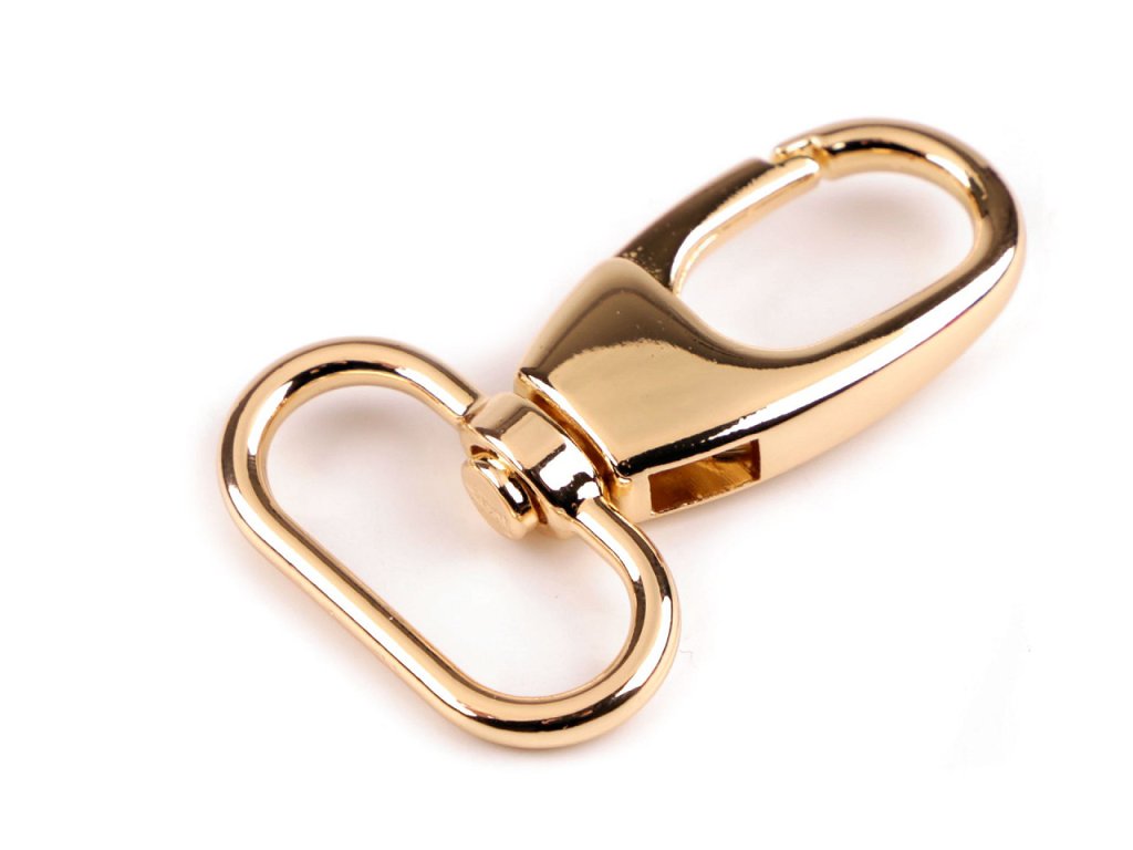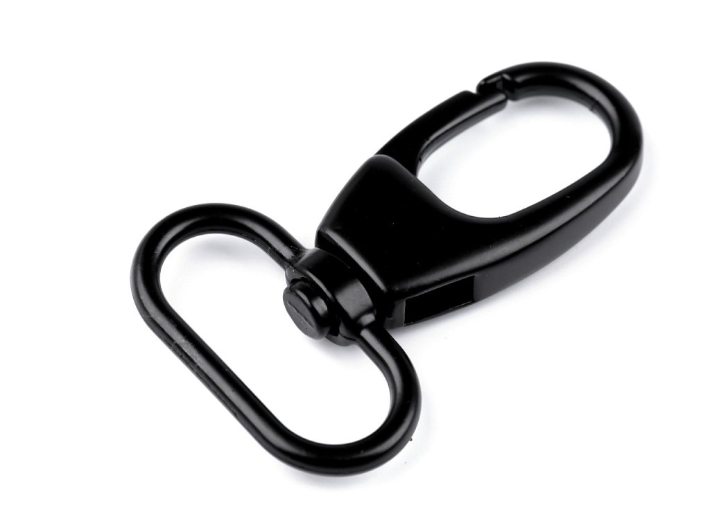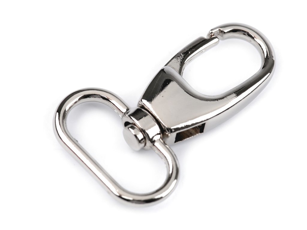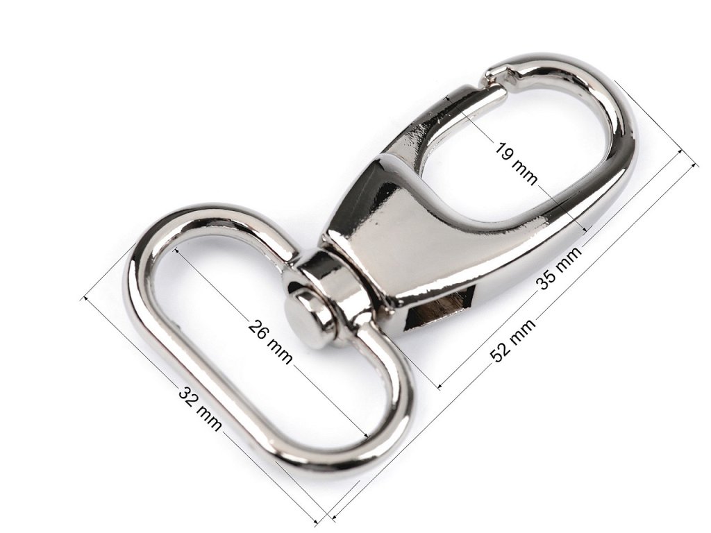 Kovovou karabinu využijete k upevnění popruhů k taškám, kabelkám i třeba k výrobě vodítek pro psy. Je otočná.- Rozměry celkem: 32 x 52 mm