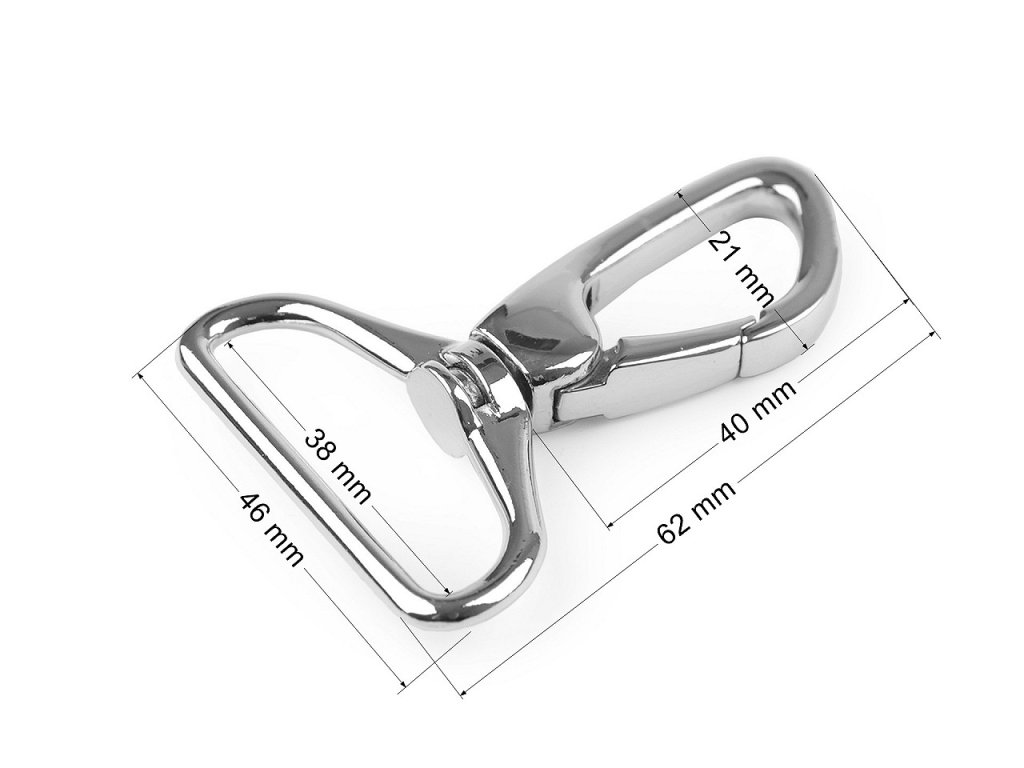 Kovovou karabinu využijete k upevnění popruhů ke sportovním taškám, kabelkám i třeba k výrobě vodítek pro větší psy.- Rozměry celkem: 46 x 62 mm
