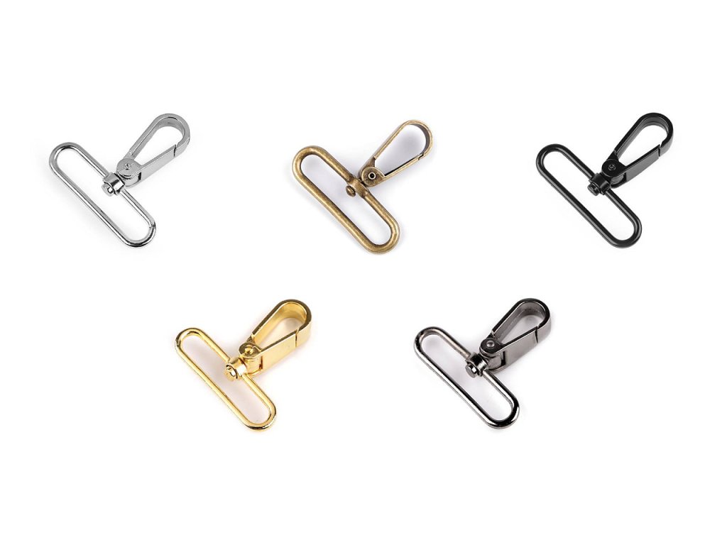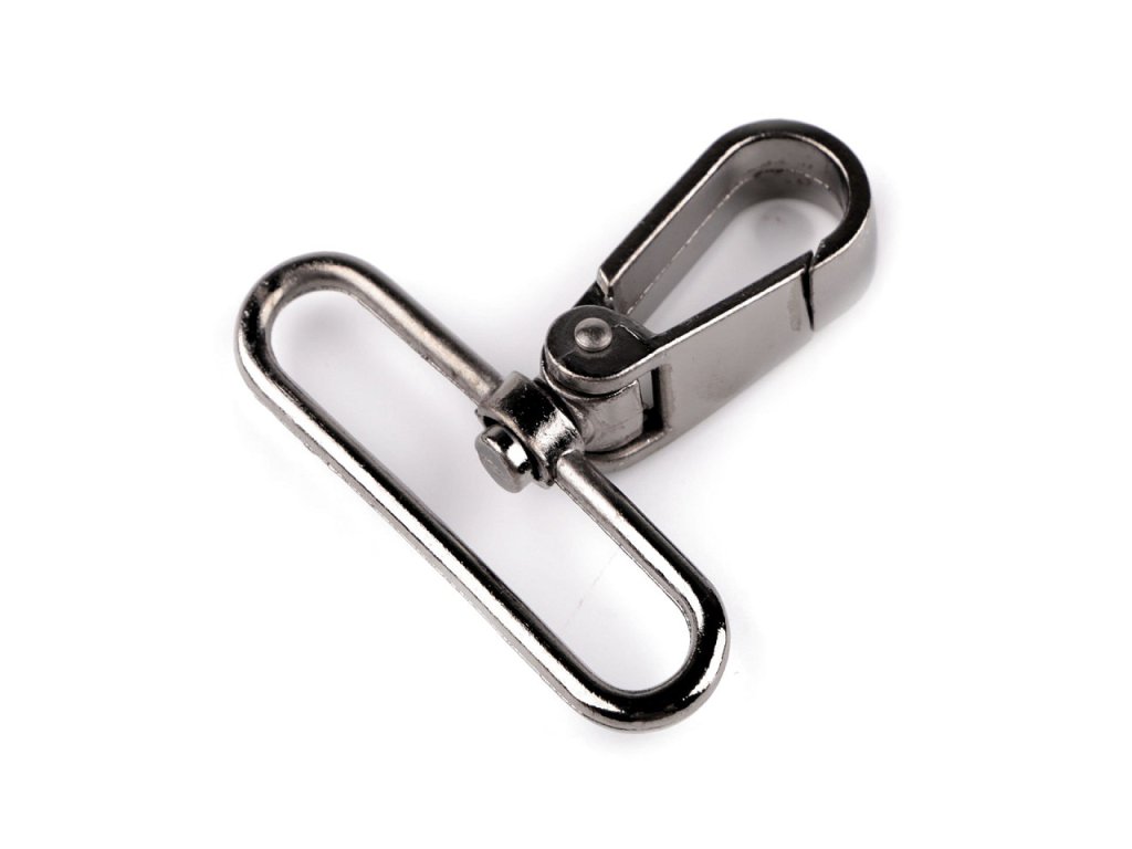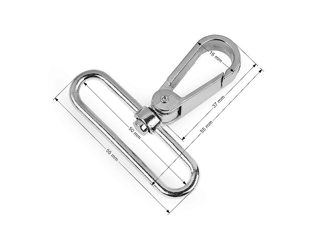 Kovová karabina je vhodná na upevnění popruhů k taškám a kabelkám. Můžete ji použít i na výrobu vodítek pro větší psy. Je otočná. Karabina je vhodná na popruh o šíři 45 - 50 mm.- Rozměry celkem: 55 x 55 mm