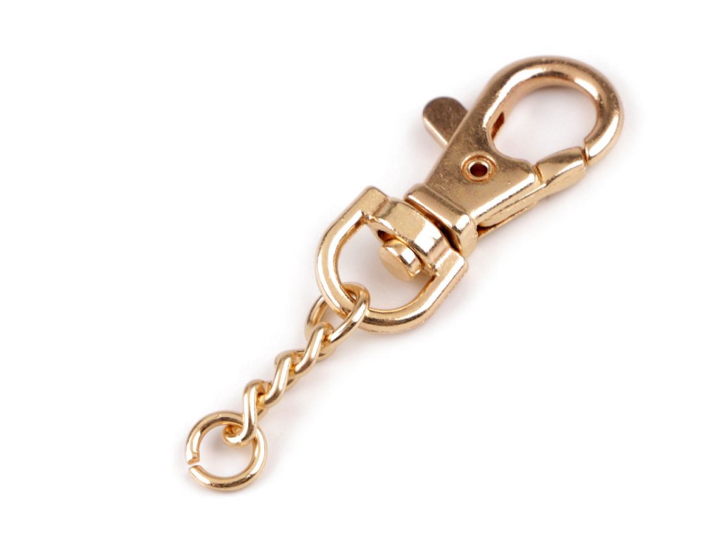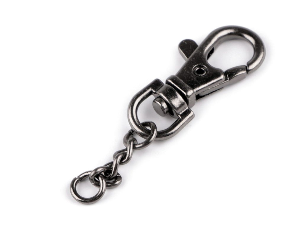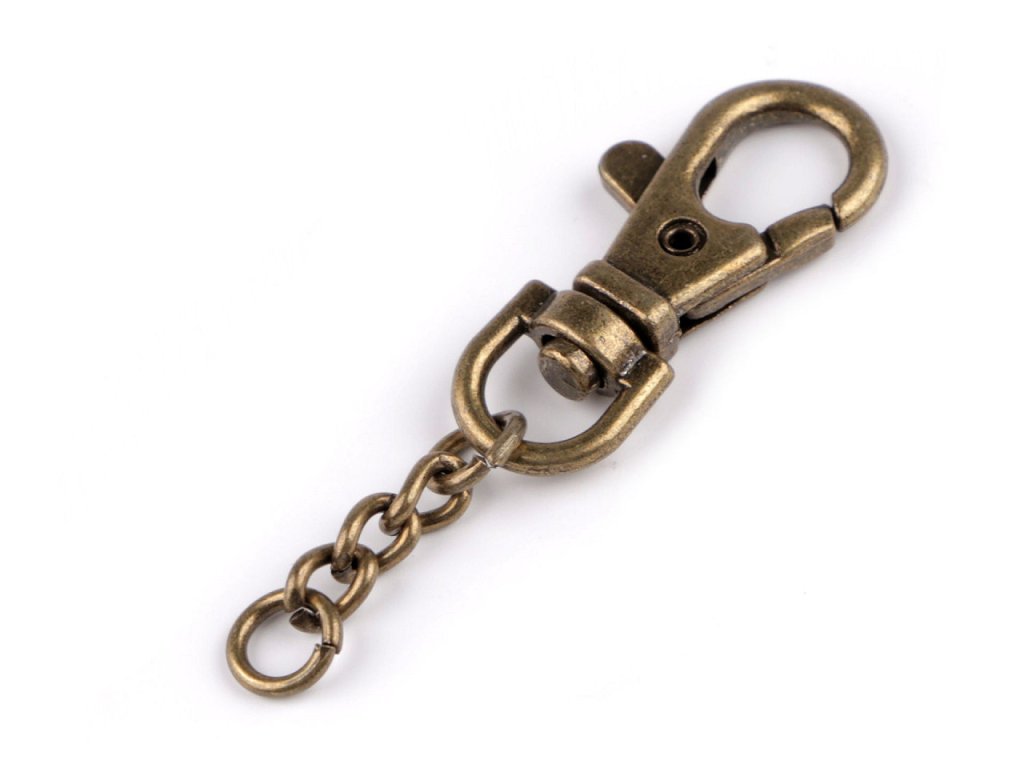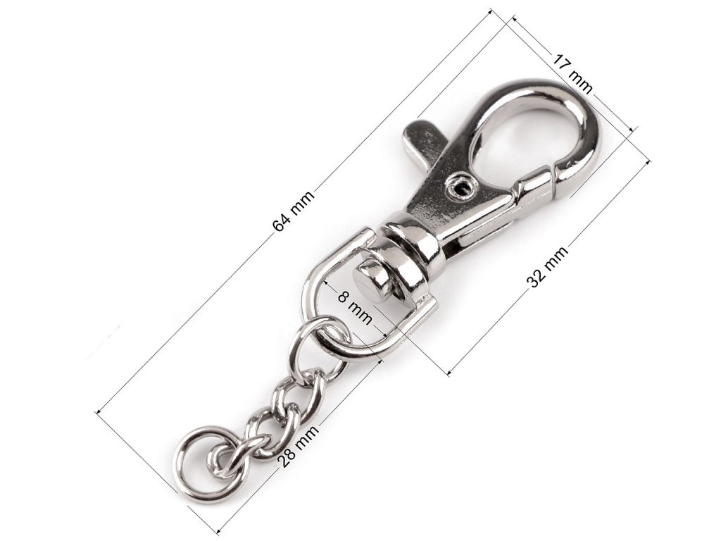 Otočnou karabinku s řetízkem využijete na výrobu klíčenek a připevnění řetízků na menší kabelky či psaníčka. Je vhodná i na připevnění přívěsku k taškám, kabelkám a batohům. Délka řetízku je 28 mm.- Rozměry celkem: 17 x 64 mm