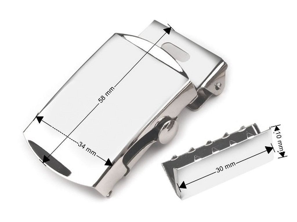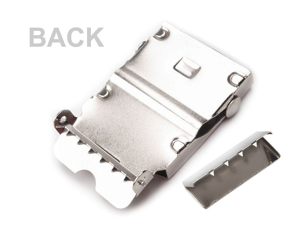 Kovová spona s koncovkou je určená na výrobu popruhových (látkových) opasků. Spona má na jedné straně zoubky, které popruh dobře zafixují a přidrží, takže materiál nebude prokluzovat. Koncovku připevněte kleštěmi na konec opasku. Spona je vhodná pro všechny klasické popruhy s tloušťkou do 3 mm.- Rozměry: 34 x 58 mm