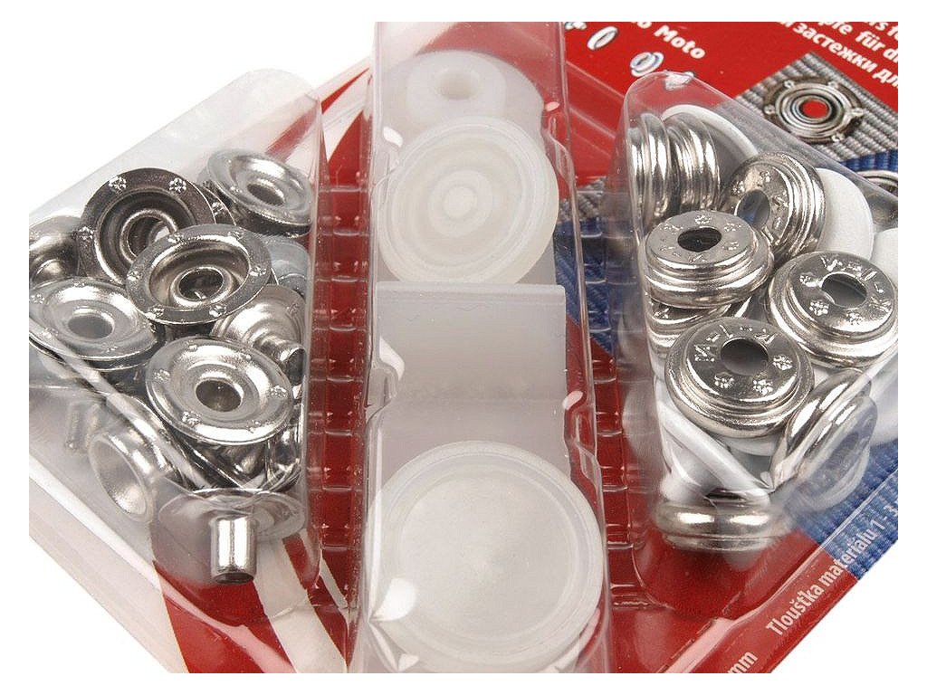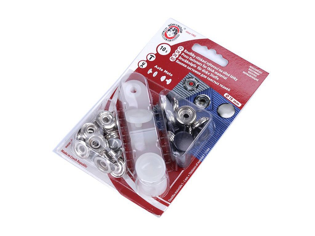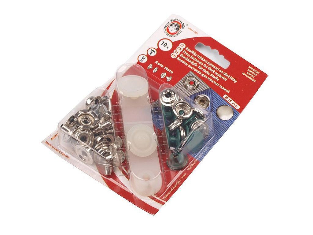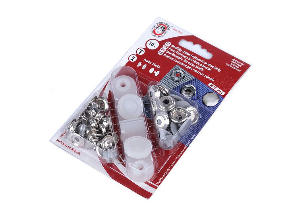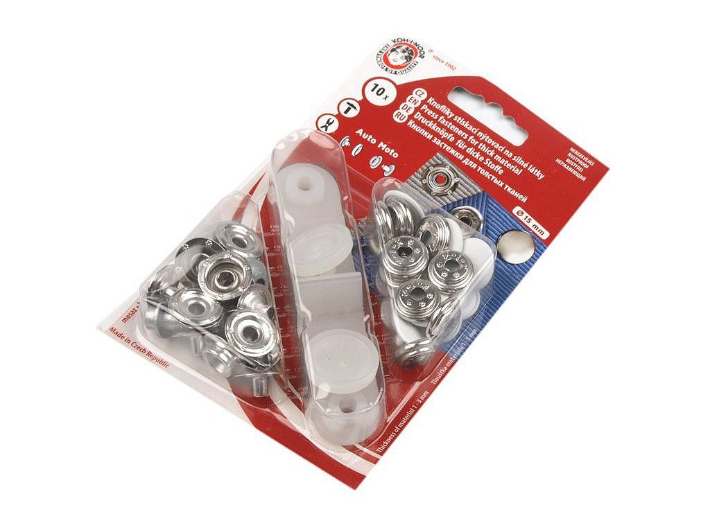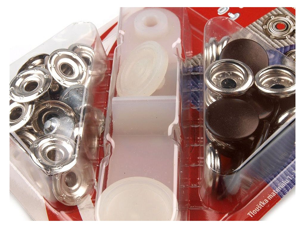 Stiskací knoflíky se používají ke spojování běžných druhů látek. Nýtování se provádí plastovým mini lisem, který je součástí balení. Knoflíky jsou nerezavějící. Návod na nýtování viz obrázek. Vhodné na tloušťku materiálu 1 - 3 mm.- Průměr: 15 mm