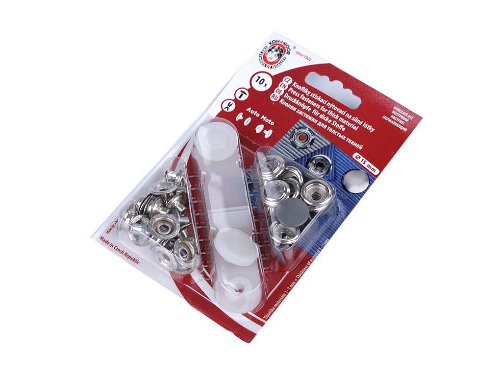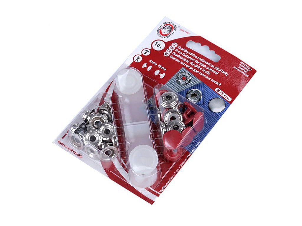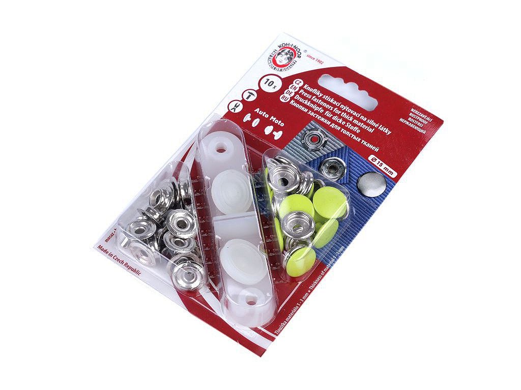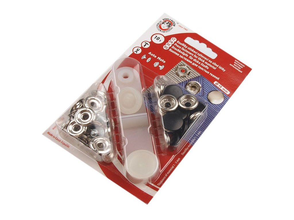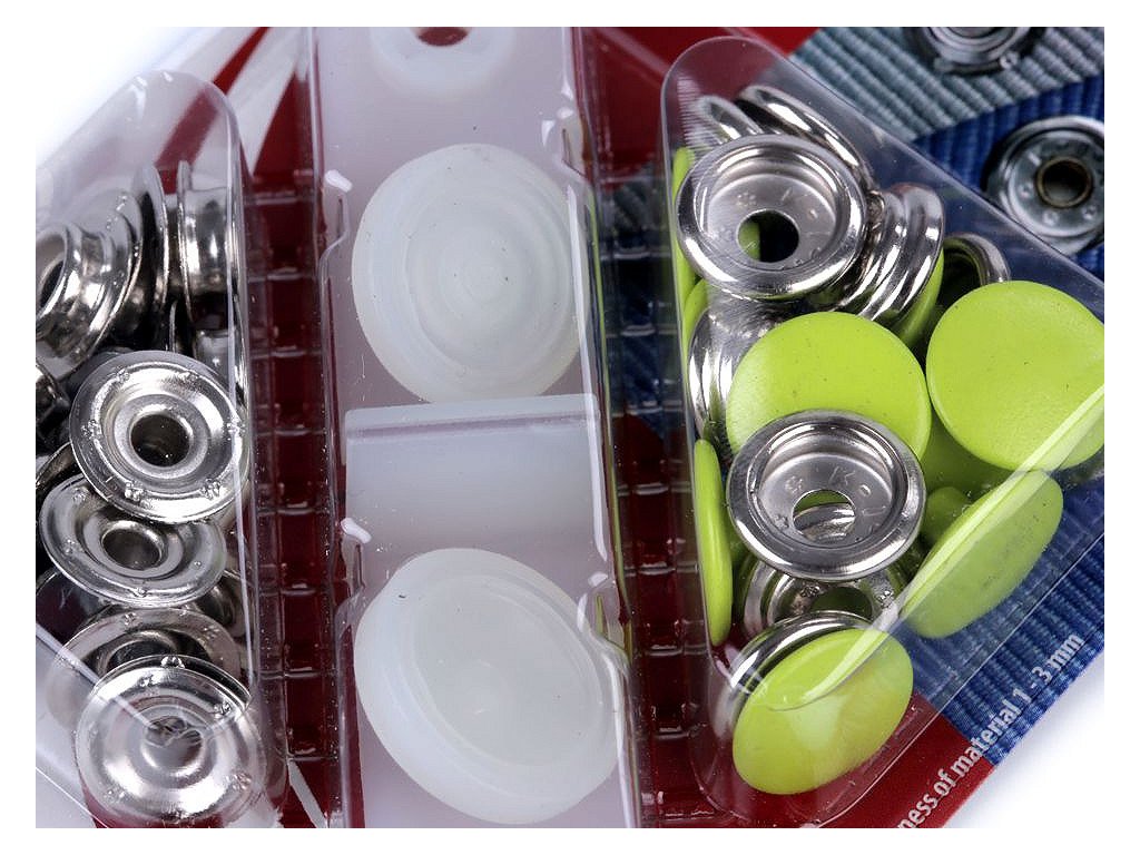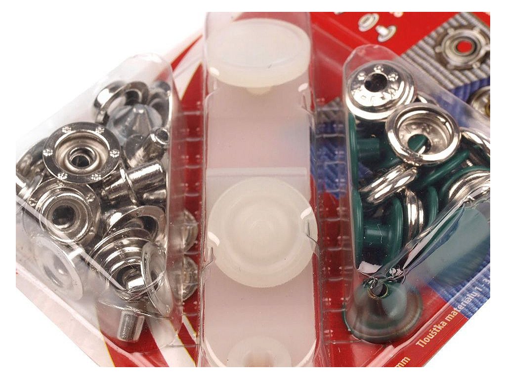 Stiskací knoflíky se používají ke spojování běžných druhů látek. Nýtování se provádí plastovým mini lisem, který je součástí balení. Knoflíky jsou nerezavějící. Návod na nýtování viz obrázek. Vhodné na tloušťku materiálu 1 - 3 mm.- Průměr: 15 mm