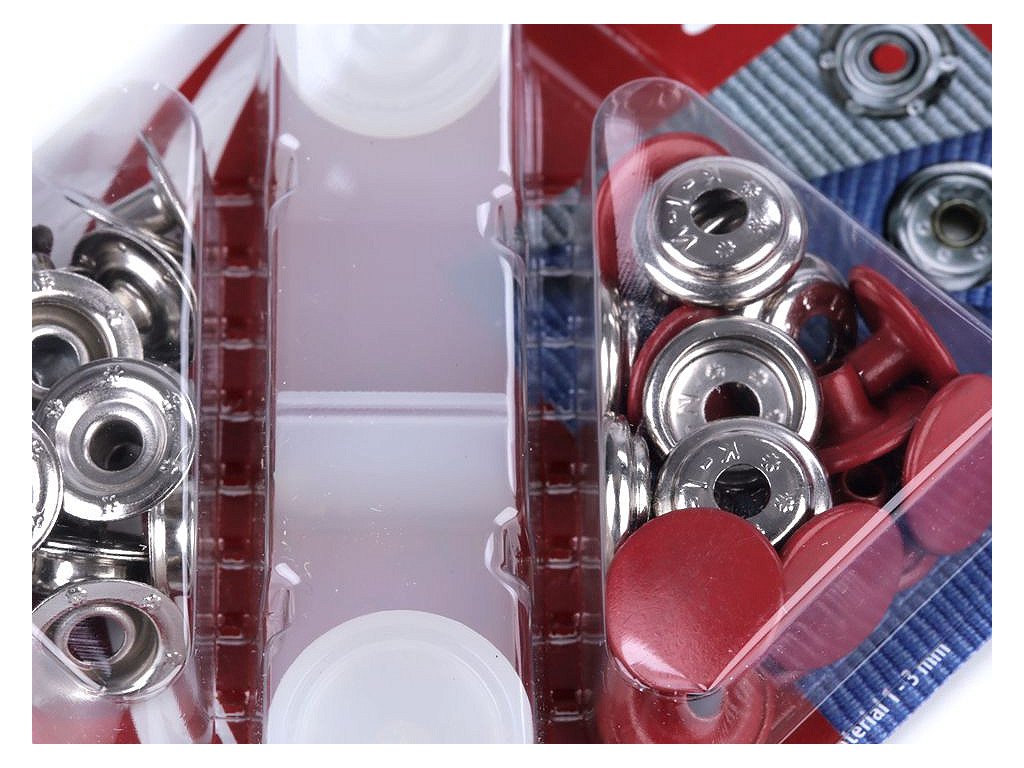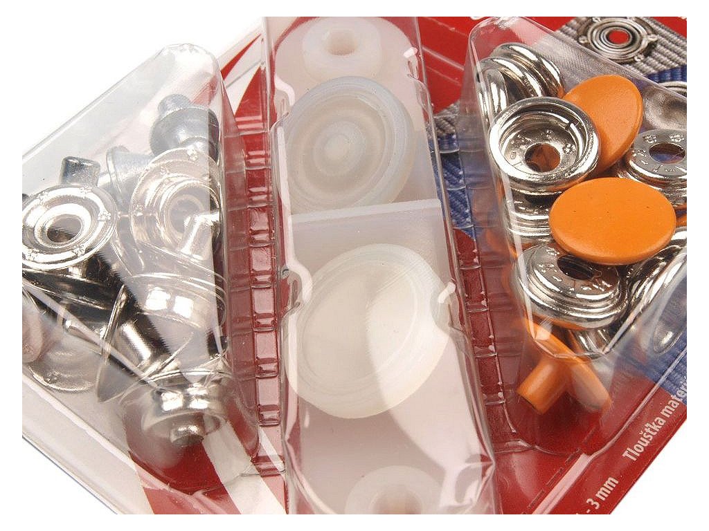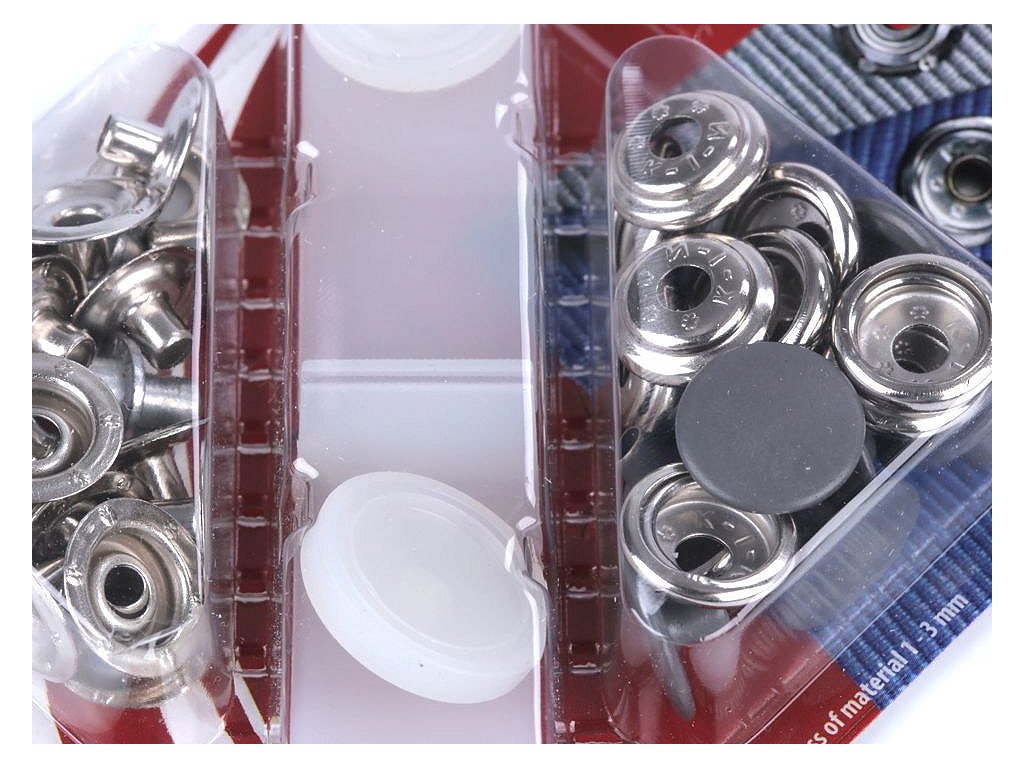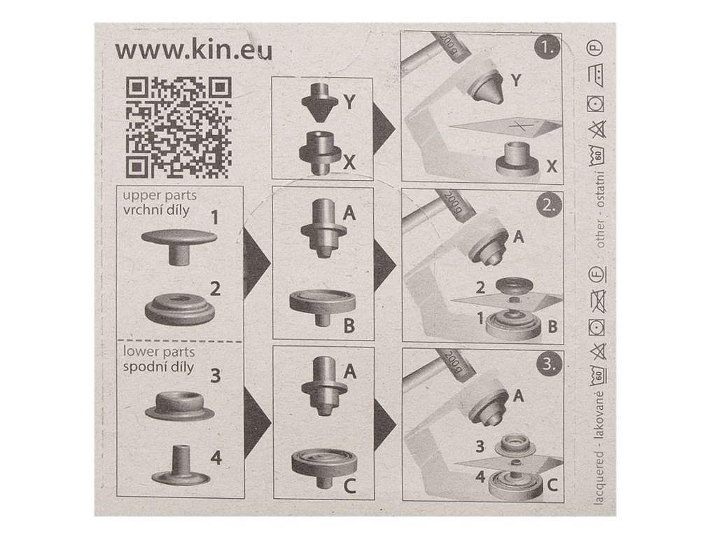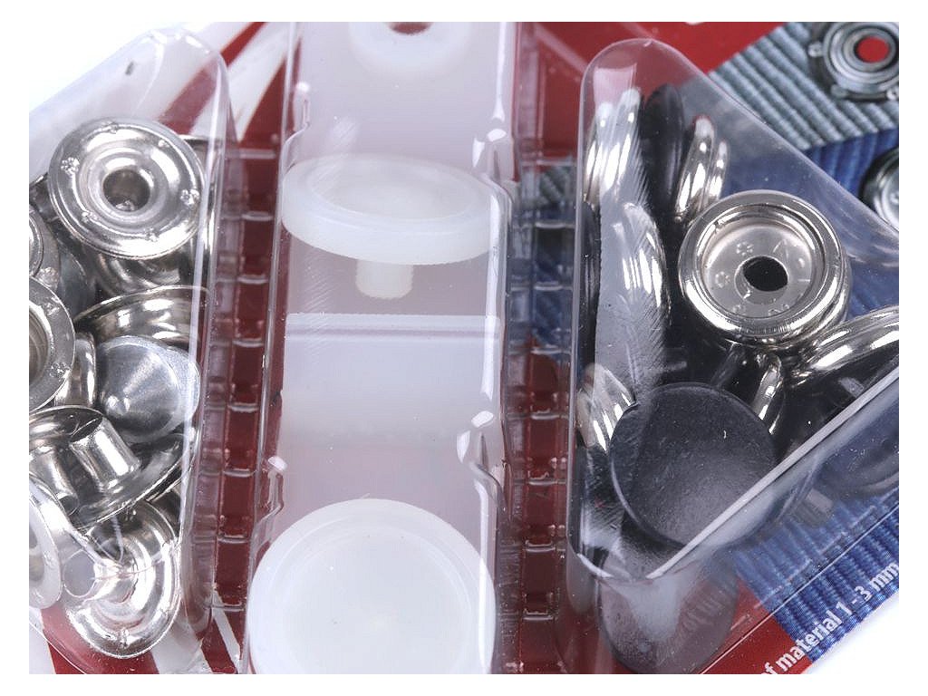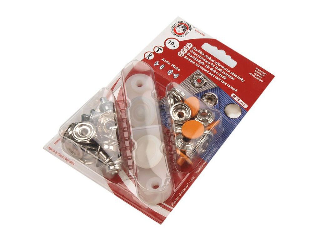 Stiskací knoflíky se používají ke spojování běžných druhů látek. Nýtování se provádí plastovým mini lisem, který je součástí balení. Knoflíky jsou nerezavějící. Návod na nýtování viz obrázek. Vhodné na tloušťku materiálu 1 - 3 mm.- Průměr: 15 mm