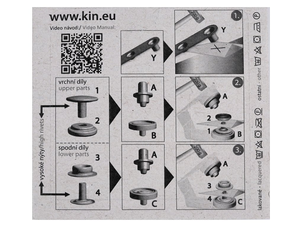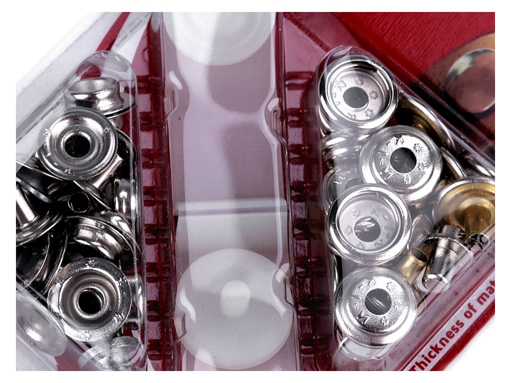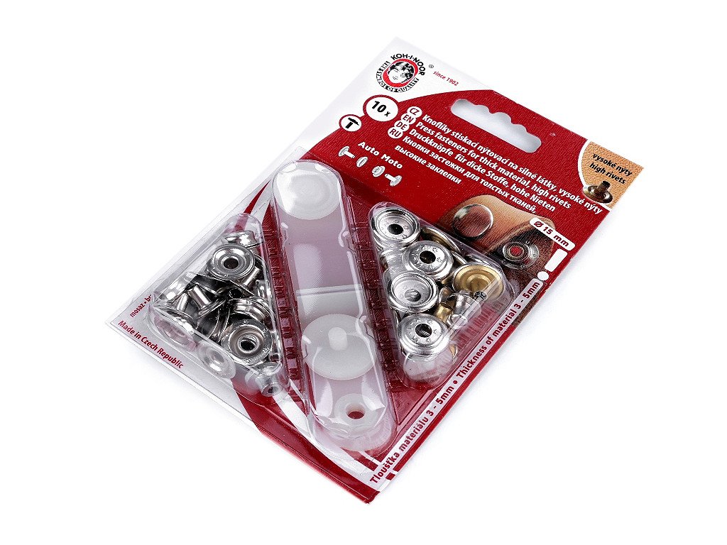 Stiskací knoflíky s vysokým nýtem jsou určeny ke spojování silných látek s tloušťkou 3 - 5 mm (ideálně na kůži a koženky). Nýtování se provádí plastovým mini lisem, který je součástí balení. Knoflíky nereziví. Výška vrchního nýtu je 8,2 mm a výška spodního nýtu je 7,5 mm.- Průměr: 15 mm
