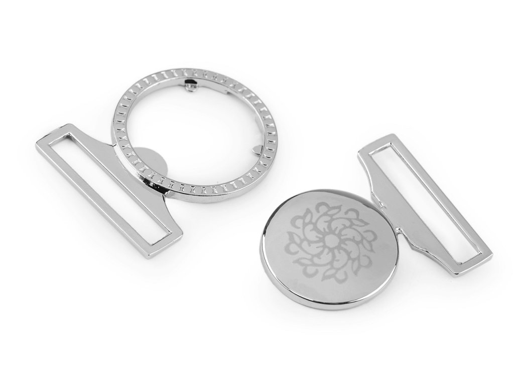 Kovová spona vyniká svým elegantním zpracováním - má vysoký lesk a její střed zdobí gravírovaný ornament. Je vhodná na výrobu opasků k šatům, sakům, kabátkům apod.- Rozměry: 35 x 55 mm