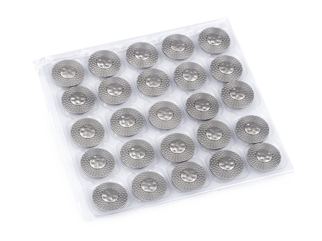 Designové kovové knoflíky vám oživí kabáty, bundy, saka, ale také doplňky jakou třeba kabelky. Mají spodní přišívání. Velikost knoflíků naleznete v této tabulce.- Průměr: 19,2; 24 mm