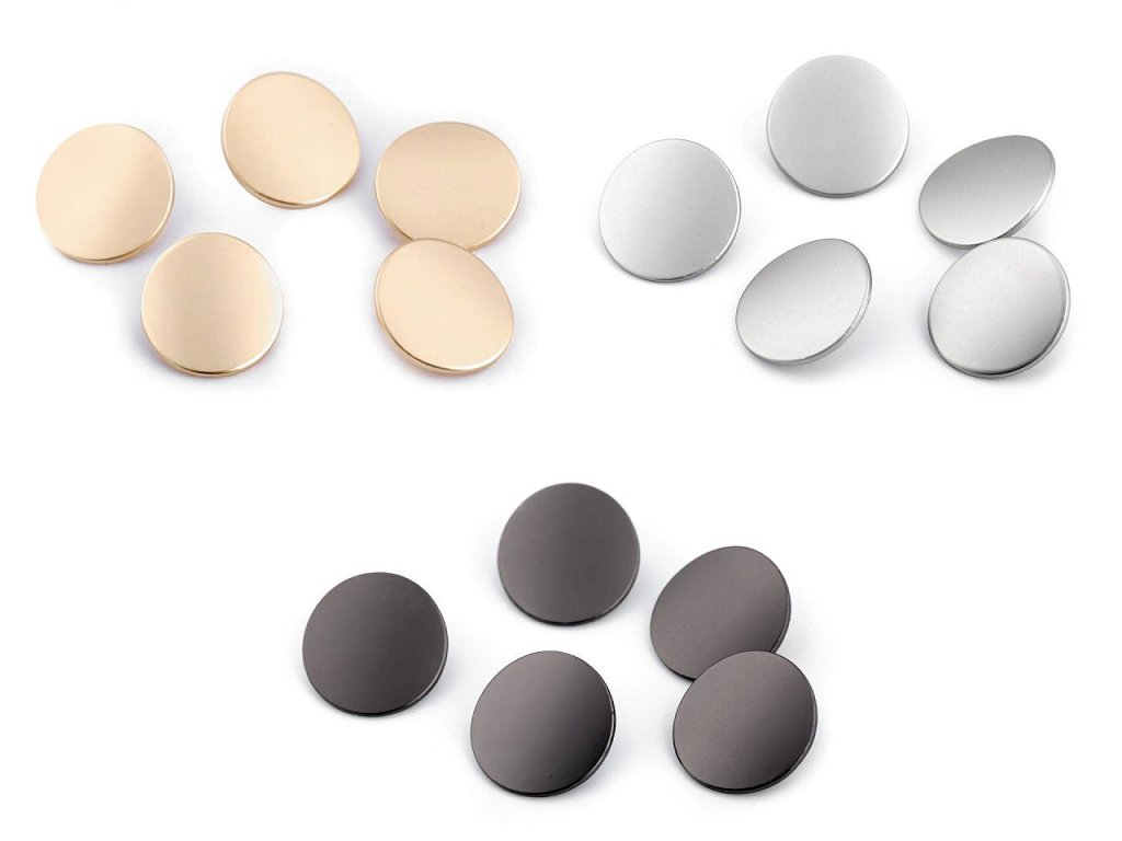 Matné kovové knoflíky se spodním přišíváním využijete k našití na saka, kabátky, svetry apod. Jsou tenké a mají nízkou hmotnost. Knoflíky jsou baleny v sáčku, kde je každý z nich ještě zvlášť zabalený v papíře.Velikost knoflíků naleznete v této tabulce.- Průměr: 19,8 mm