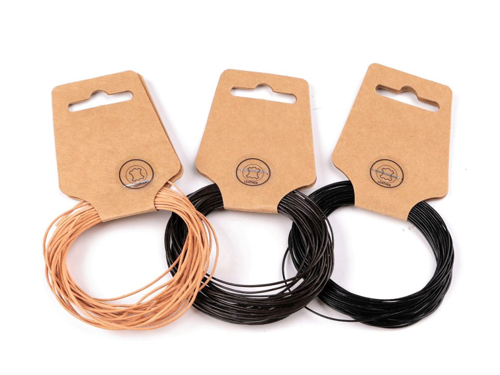Tenká kulatá šňůrka z hovězí kůže má široké možnosti použití. Hodí se na ozdobné šněrování oděvů a kabelek, vedle voskovaných šňůr je nejčastějším návlekovým materiálem pro bižuterii. Šperkaři na ní zavěšují přívěsky dá se i různě splétat do náhrdelníků a náramků. Šňůrka č.1 je přírodní, není úplně kulatá, je plochá, z jedné strany hladká, z druhé strany broušená. Šňůrka č.2 a 3 je kulatá, lakovaná, má lesklý povrch.- Průměr: 1 mm