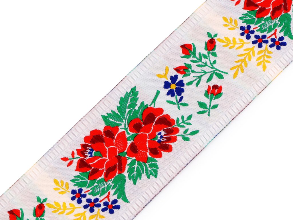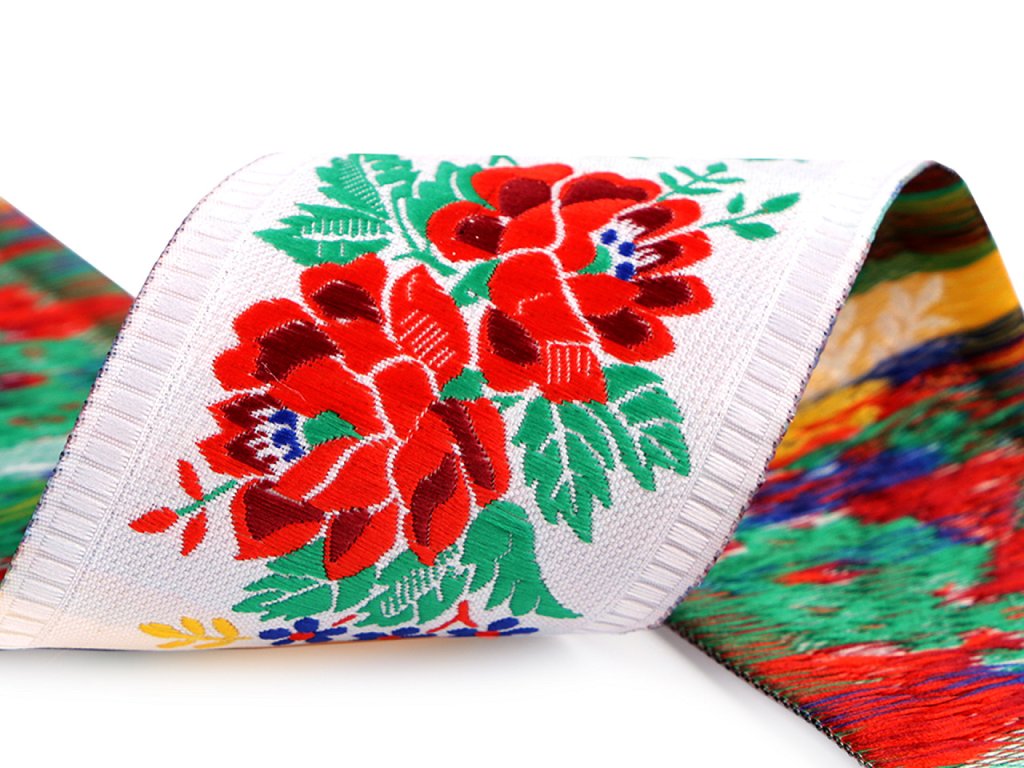 Krojová vzorovka byla původně určená pouze ke zdobení krojů, dnes je ideální pro milovníky tradičních motivů a folklórních stylů, kteří touží po návratu ke kořenům a rádi kombinují tradici s moderním designem. Je vhodná na ozdobení běžných oděvů, ale i bytových textilií, upomínkových předmětů, apod. Barevný vzor stuhy vynikne na každé látce. Tyto stuhy jsou tkány na jehlových stavech a vyrábějí se v materiálu polyester. V návinu 12 m může být jeden prostřih. Krojovka je ve 2. jakosti, protože na bílém podkladu prosvítají žlutě tkané proužky.- Šíře: 55 mm