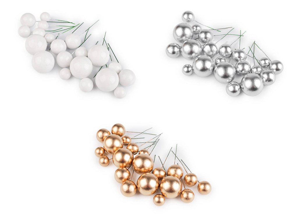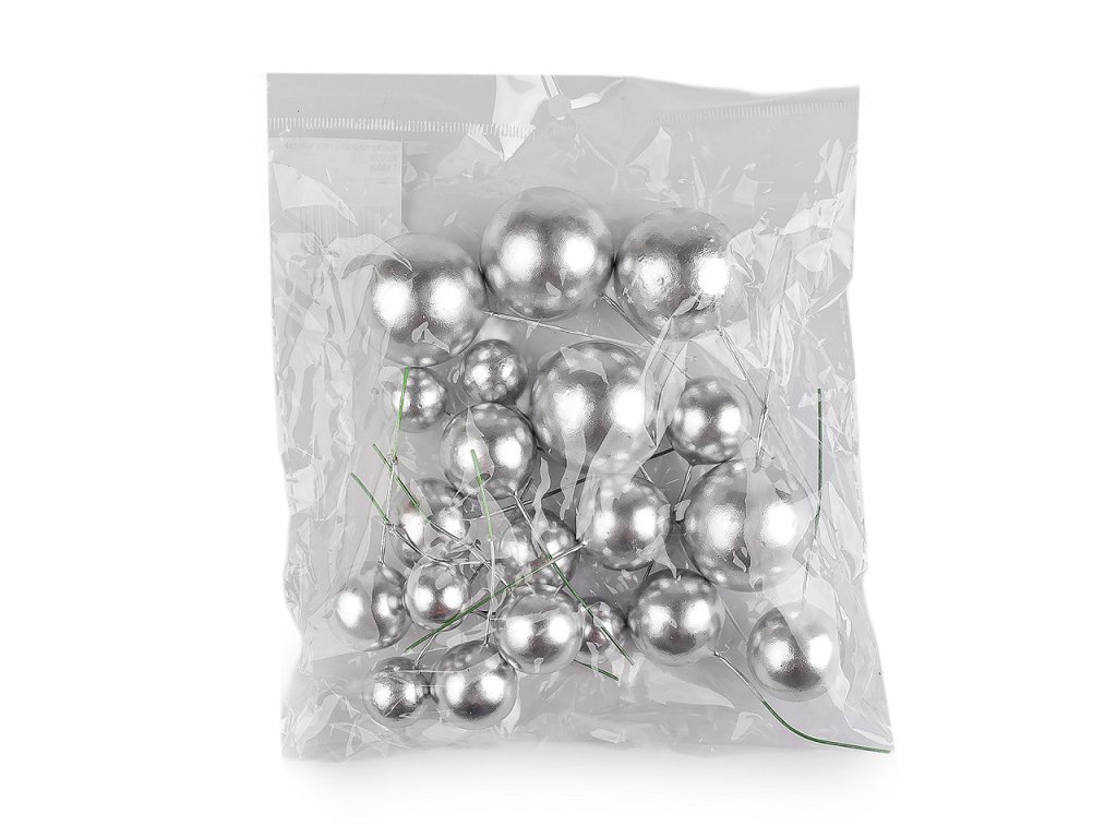 Dekorační kuličky jsou připevněné k ohebnému floristickému drátku. Můžete je zakomponovat do květinových vazeb, věnců, truhlíků a různých dekorací. Mix různých velikostí přidává výrobkům zajímavou dynamiku a umožňuje kreativní variabilitu.- Průměr: 2; 2,5; 3; 4 cm