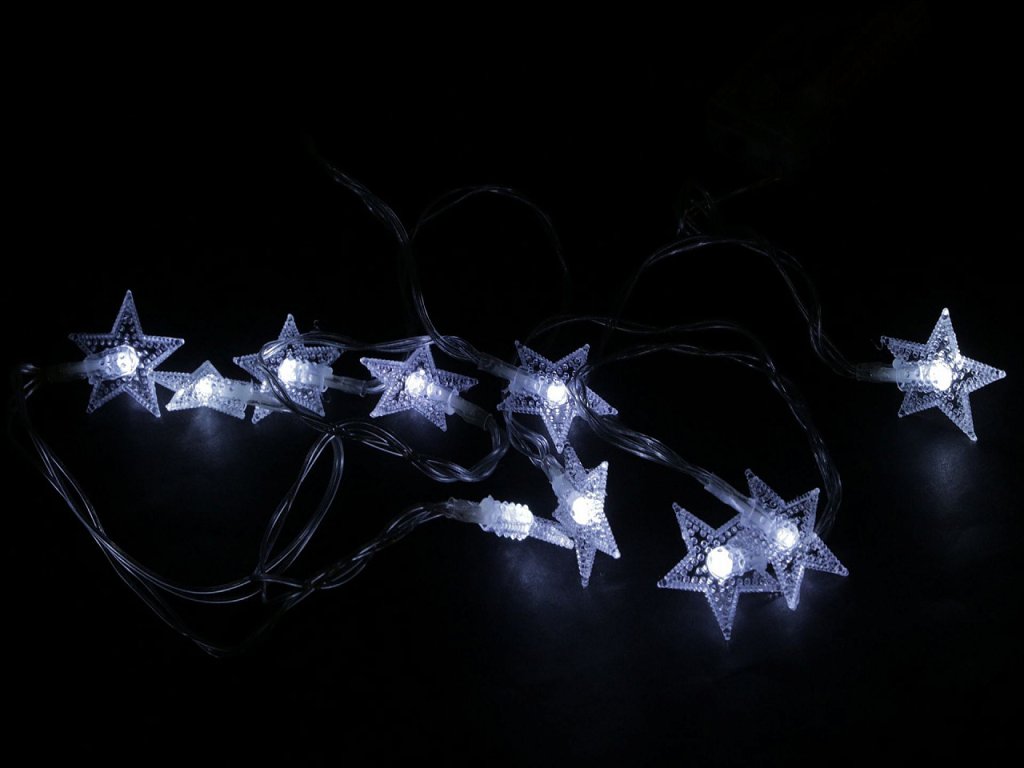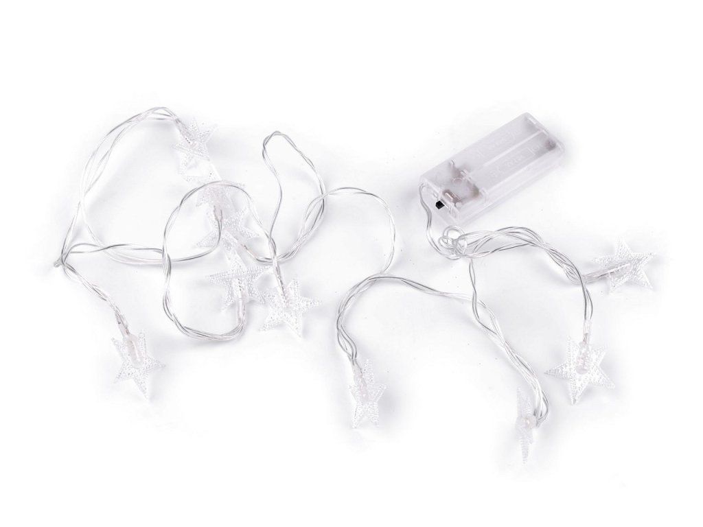 Na světelném řetězu najdete 10 nebo 20 LED diod. Rozestup mezi jednotlivými světýlky je 15 - 20 cm. Řetěz svítí, nebliká. Řetěz je na 3 kusy AA baterií, které nejsou součástí. Je určený na vnitřní použití. Průměr hvězdy č. 1 je 3,5 cm a svítí studeným světlem. Je zde 10 diod a řetěz je na 2 ks AA baterií. Průměr vločky č. 2 je 3 cm a svítí studeným světlem. Rozměry stromečku č. 3 jsou 2,5 x 3 cm a svítí studeným světlem. Průměr vločky č. 4 je 3,5 cm a svítí studeným světlem. Je zde 10 diod a řetěz je na 2 ks AA baterií.- Délka: 2,1 - 3 m