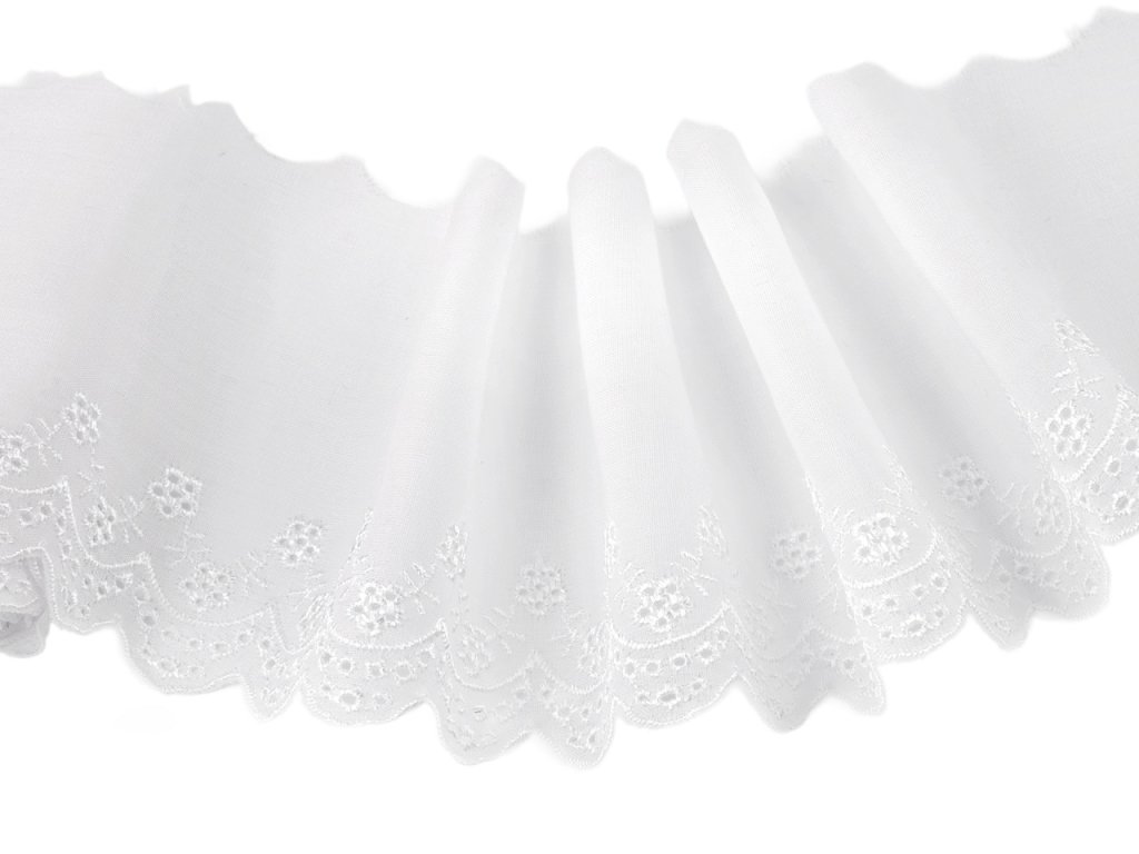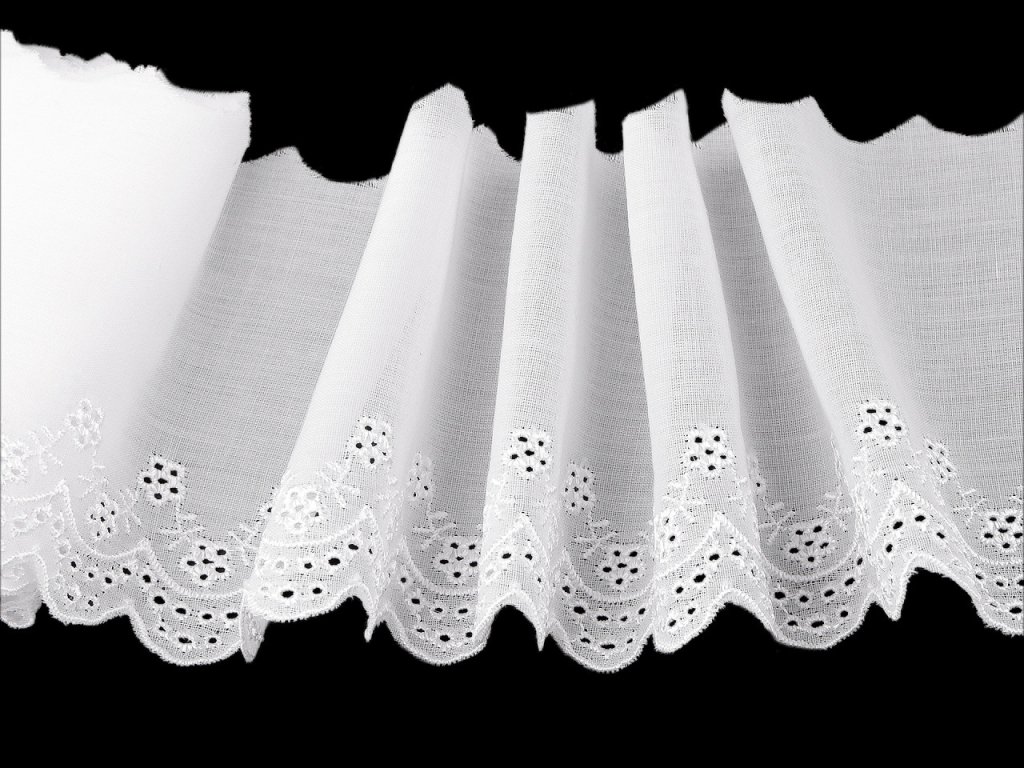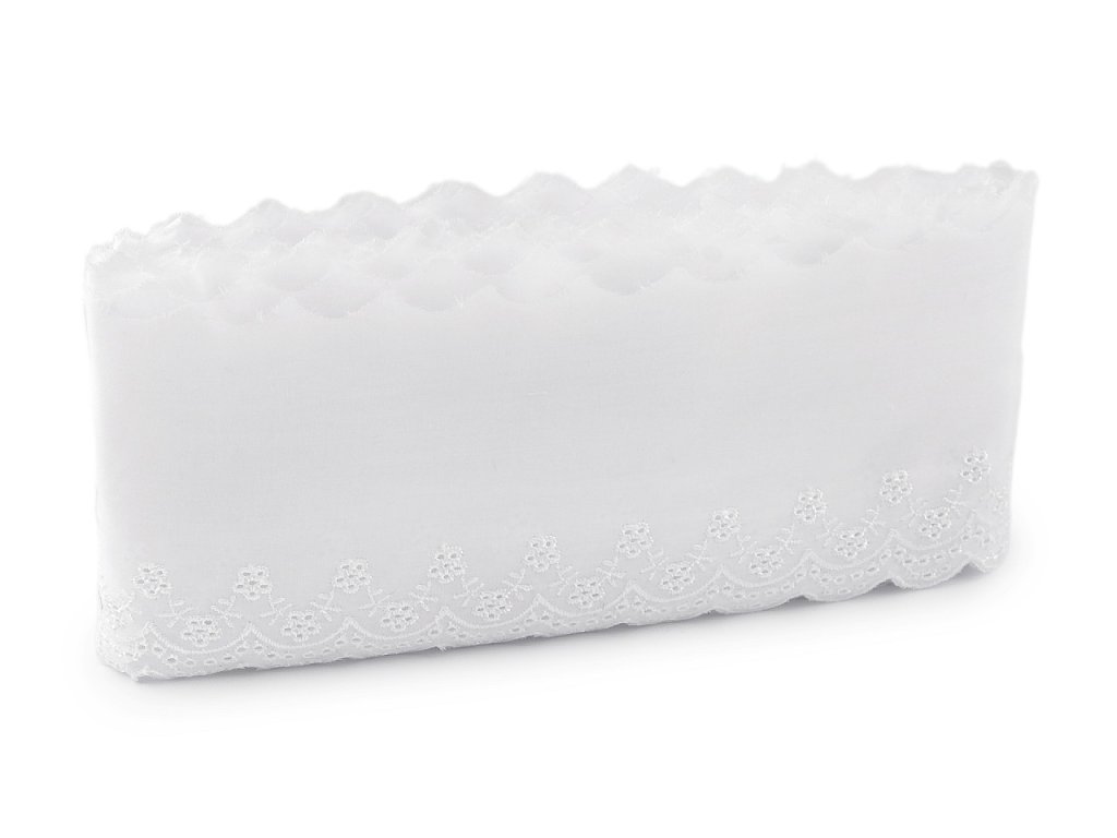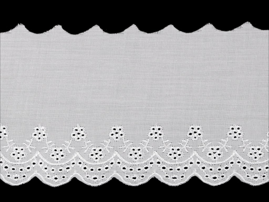 Madeiru s jemnou květinovou dírkovanou výšivkou můžete našít na oděvy, kde vytvoří originální a atraktivní detaily jako jsou lemy rukávů, sukní nebo výstřihů. Dále je vhodná na ozdobení ubrusů, závěsů, záclon, dekoračních polštářů nebo ložního prádla. Šíře nevyšité části se může mírně lišit (±10%).- Šíře: 11 cm