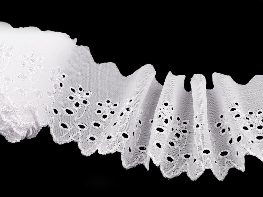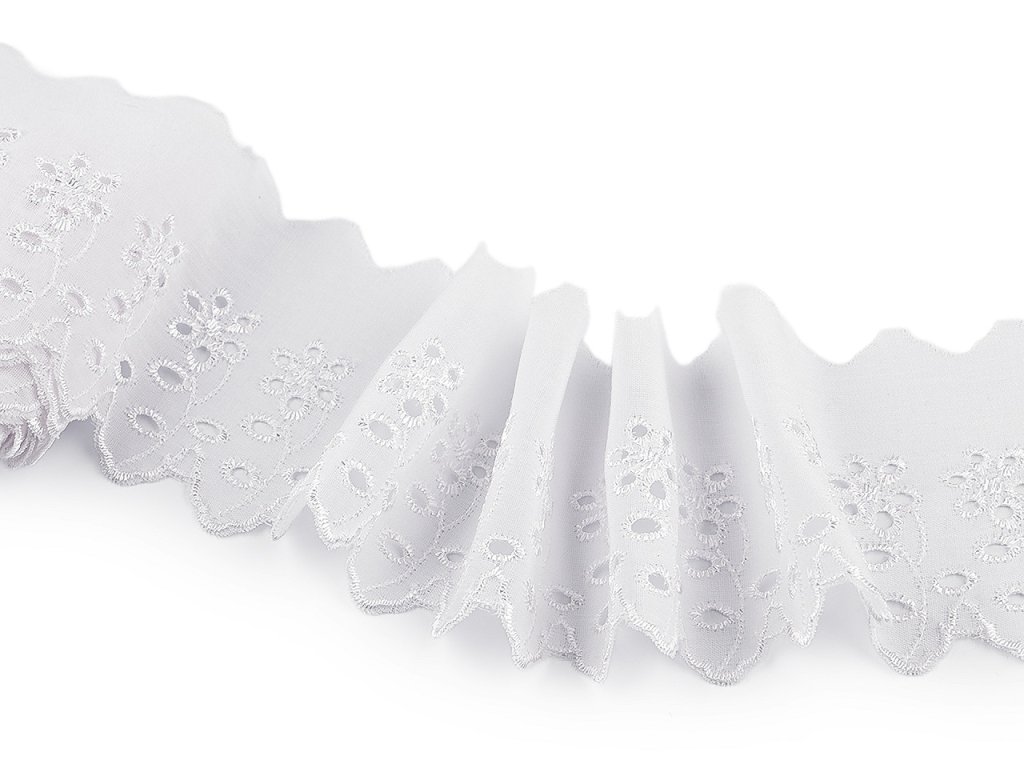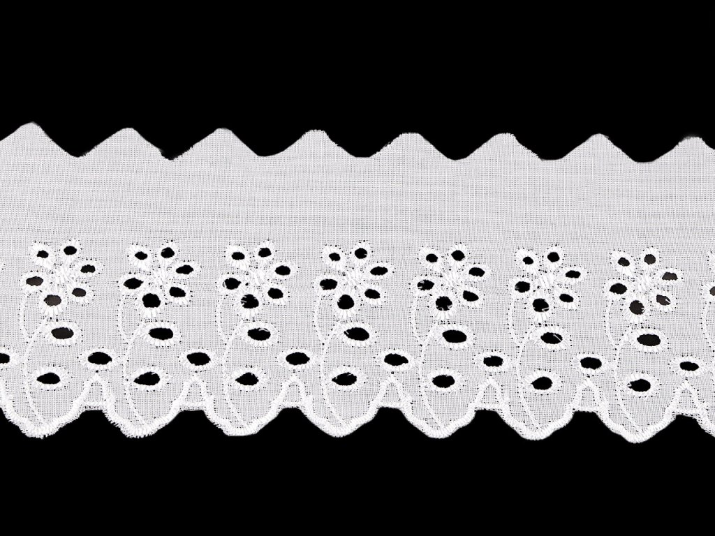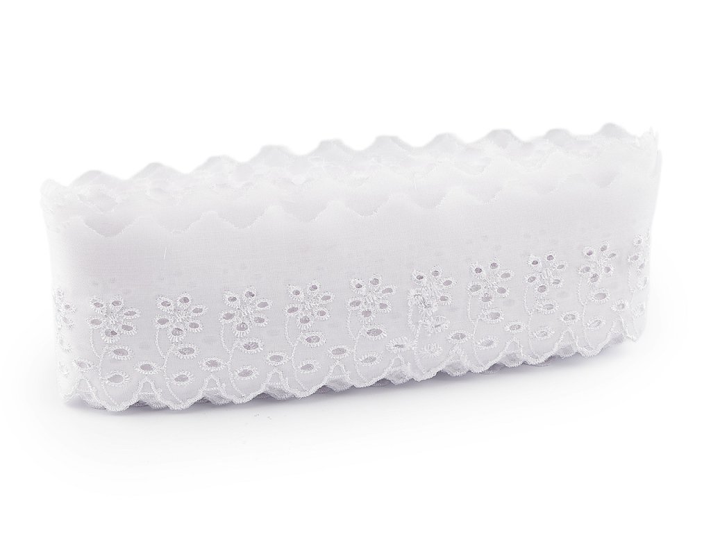 Madeiru s květovanou dírkovanou výšivkou využijete k dekoraci ubrusů, závěsů nebo ložního prádla. Rovněž je ideální pro zdobení oděvů, kde vytvoří originální a atraktivní detaily jako jsou lemy rukávů, sukní nebo výstřihů. Šíře nevyšité části se může mírně lišit (±10%).- Šíře: 80 mm