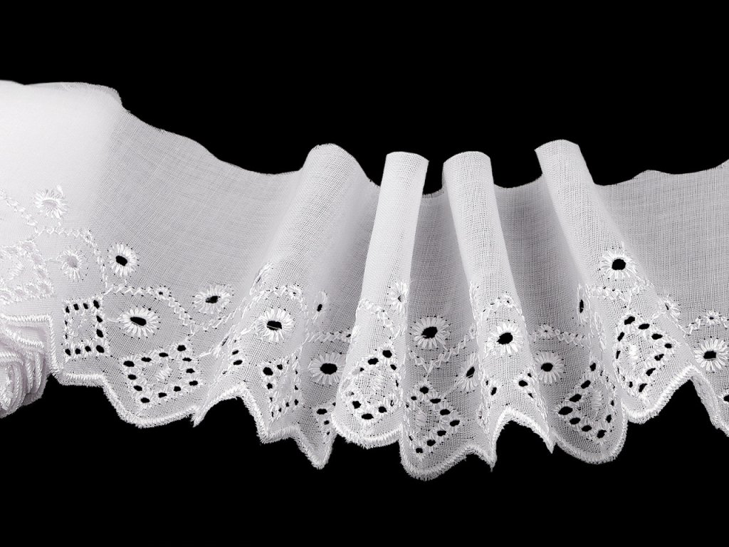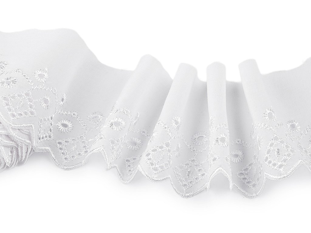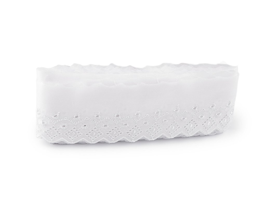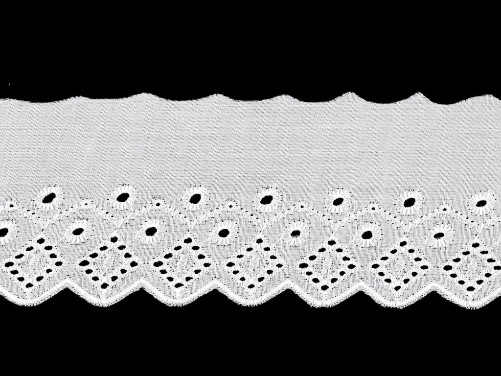 Madeira s dírkovanou výšivkou se hodí na dekoraci ubrusů, závěsů nebo ložního prádla. Rovněž je ideální pro zdobení oděvů, kde vytvoří originální a atraktivní detaily jako jsou lemy rukávů, sukní nebo výstřihů. Šíře nevyšité části se může mírně lišit (±10%).- Šíře: 80 mm
