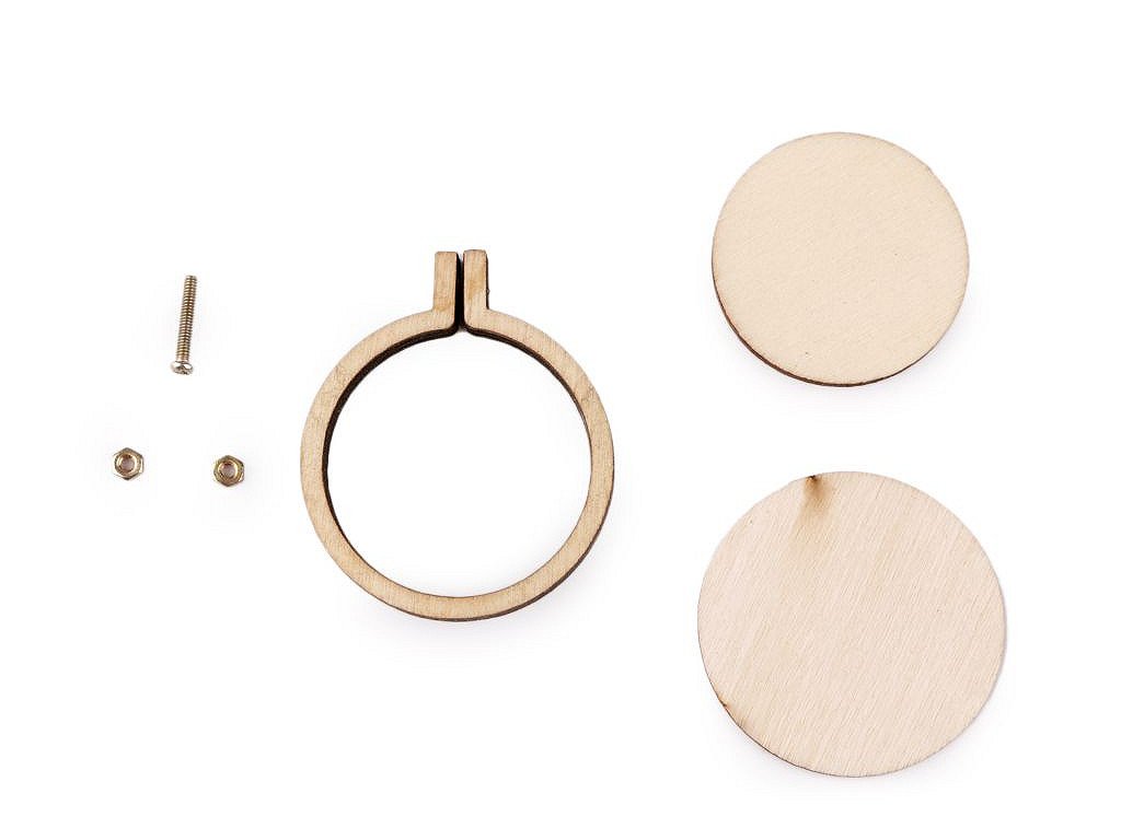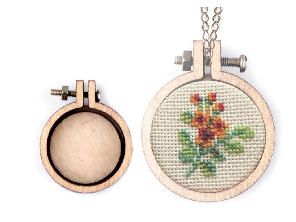 Malý dřevěný rámeček využijete na tvoření drobných vyšívaných obrázků. Hotové obrázky v rámečku můžete nosit jako přívěsek na krku nebo s nimi můžete ozdobit dárky apod. Vyšitý obrázek nalepte na menší destičku, větší destičku nalepte ze zadní strany rámečku a vložte do rámečku menší destičku s obrázkem. Rámeček v horní části utáhněte přiloženým šroubkem a maticemi. Kulatý přívěsek č.1 má vnější průměr 40 mm, vnitřní 34 mm. Oválný přívěsek č.2 má vnější rozměry 32 x 67 mm, vnitřní 27 x 55 mm.- Rozměry: 32 - 67 mm