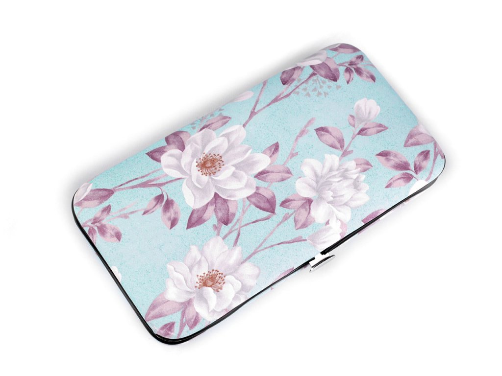 Manikúra v pouzdře s drobným květinovým potiskem potěší každou ženu či dívku. Pouzdro má kvalitní kovový rám, který jednoduše otevřete stisknutím páčky a zavřete zaklapnutím. Povrch pouzdra je z eko kůže. Manikúra je praktická, pohodlně se vejde do kabelky, je vhodná i na cestování. Manikúra obsahuje: nehtové nůžky, pilník, pinzetu, 5 kusů manikúrových nástrojů a 4 kusy nehtových kleští.- Šířka: 8 cm