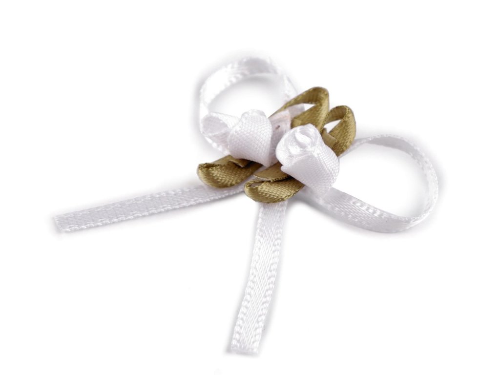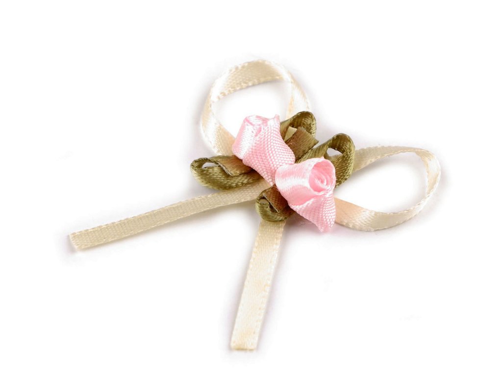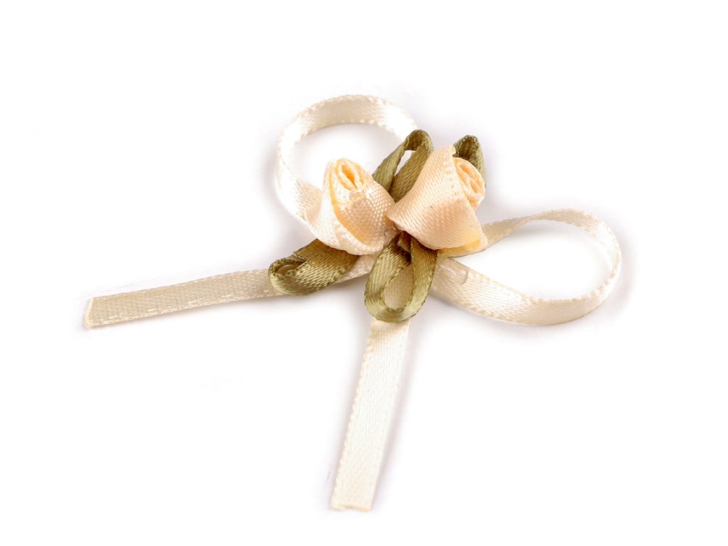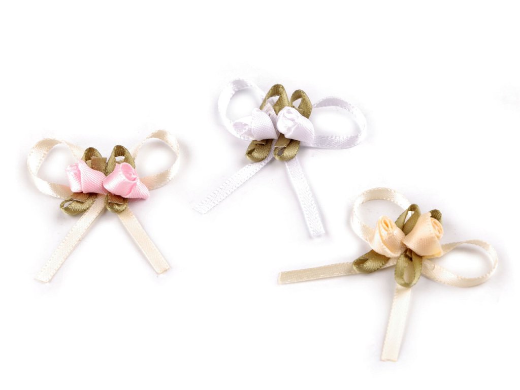 Mašlička s růžičkami je velice oblíbená, slouží především k ozdobení klopy svatebčanů. Mašlička je ze saténové stužky, je ozdobená párem růžiček. Mašličky můžete použít také k aranžování různých svatebních dekorací, k ozdobení svatebních oznámení, pozvánek, krabiček apod. Vyniknou i na módních doplňcích jako jsou klobouky, čelenky, kabelky, boty apod. Mašličky nemají špendlík k připíchnutí.- Rozměry: cca 4 x 4,5 cm