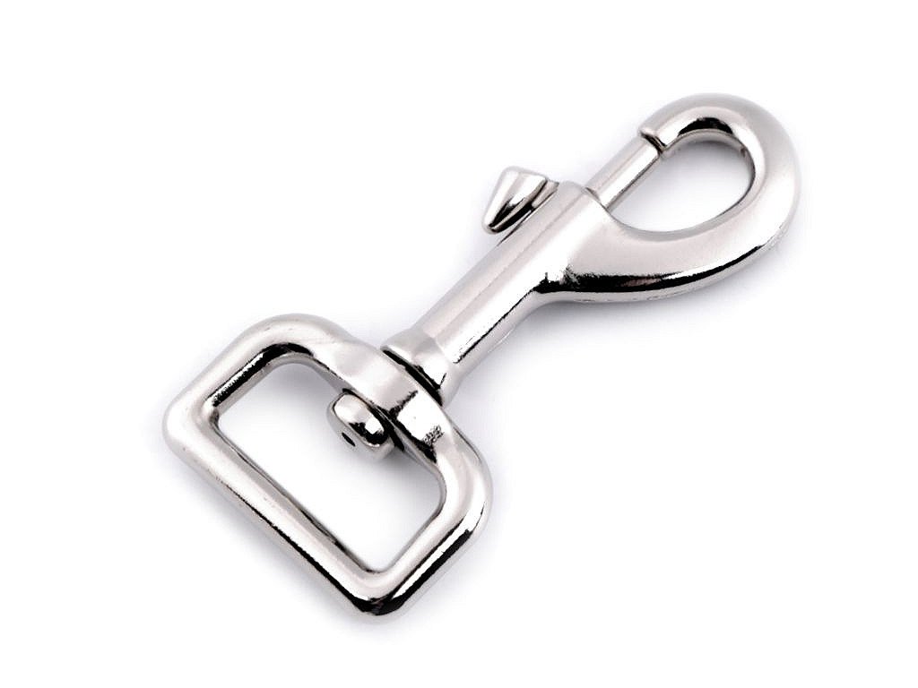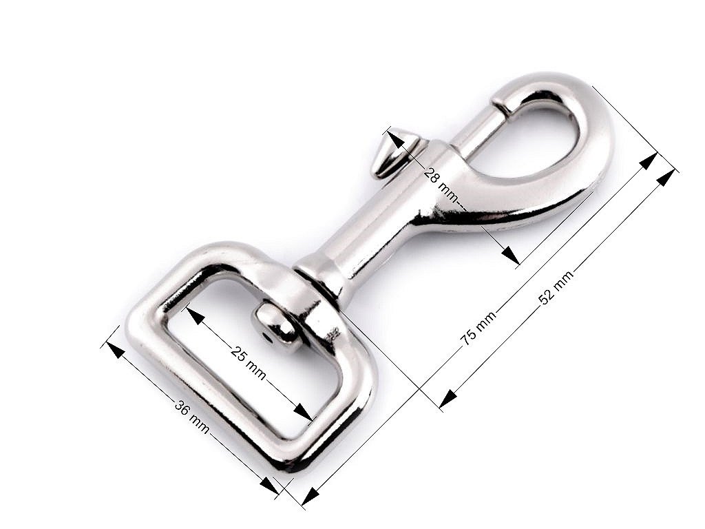 Mohutnou kovovou karabinu využijete hlavně na výrobu vodítek pro velké rasy psů. Dále ji můžete použít na kabelky, sportovní tašky, kufry apod. Je otočná.- Rozměry celkem: 36 x 75 mm