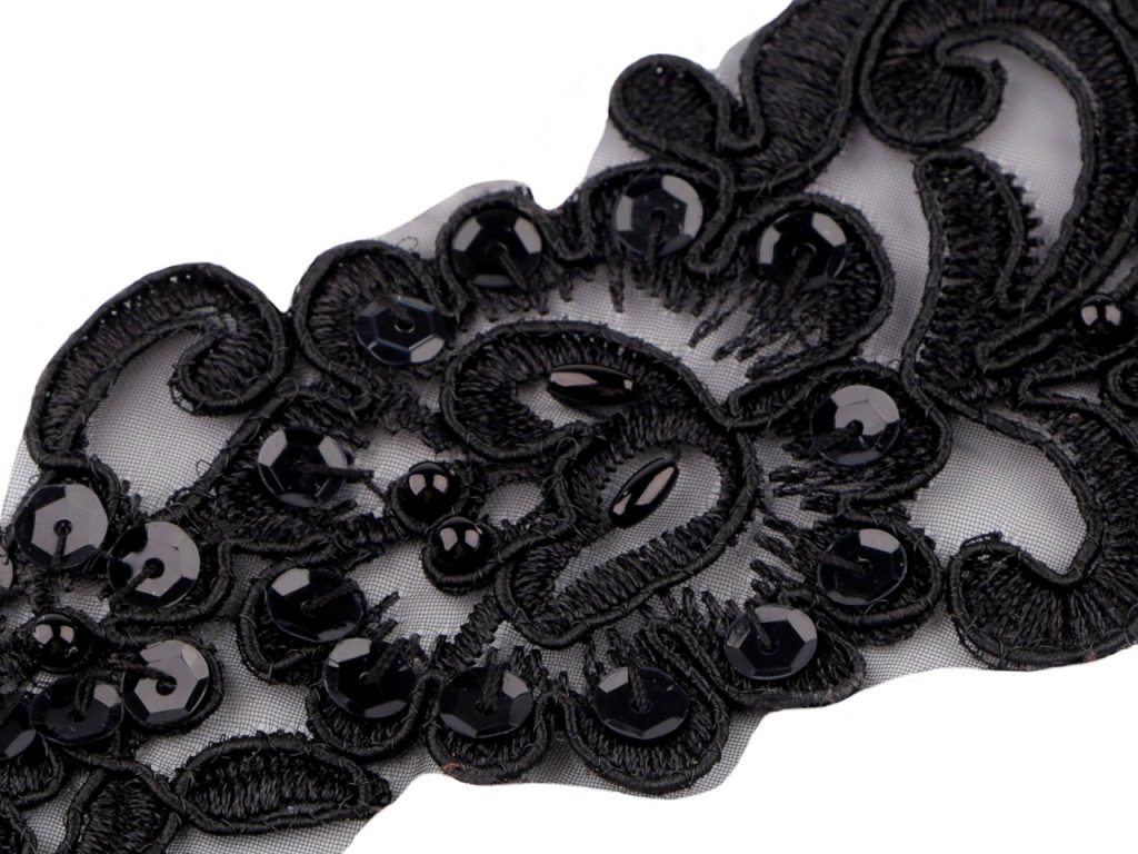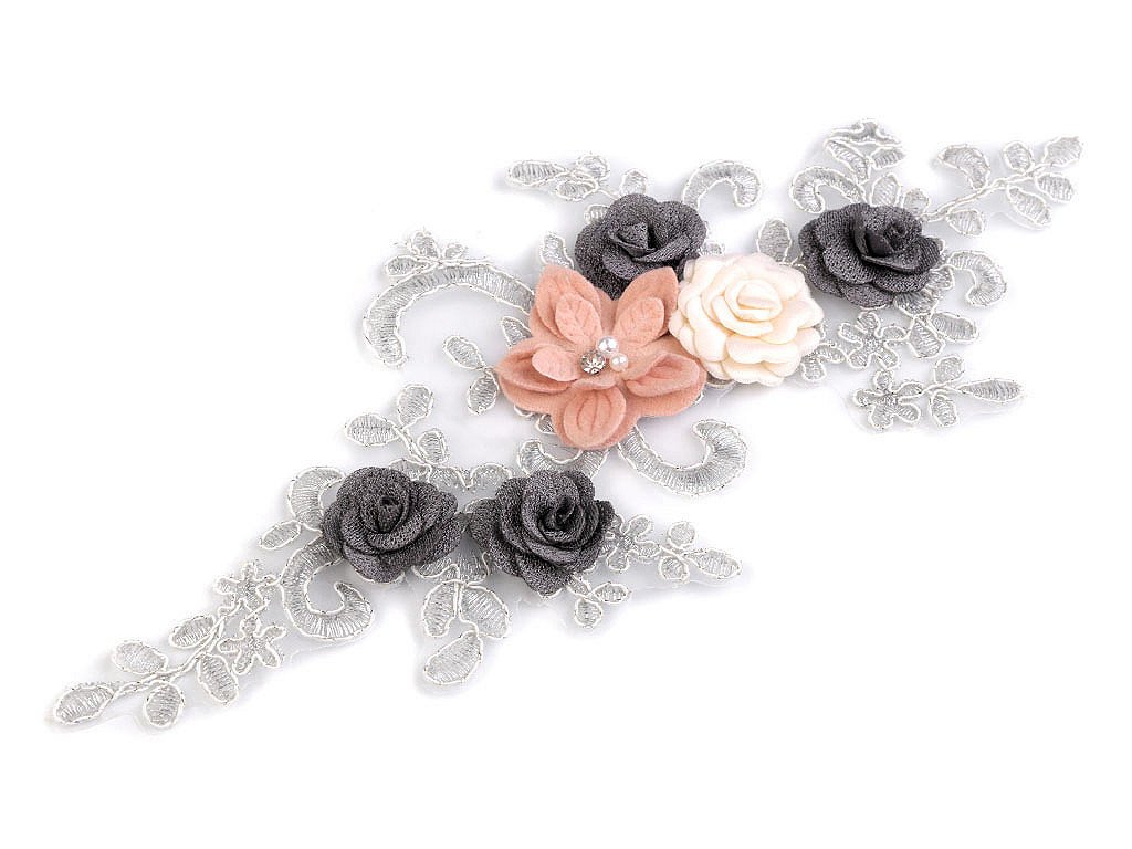 Monofilová vsadka působí honosně, ale zároveň jemně a elegantně. Monofilový podklad je ozdobený ornamenty. Dominantou celé aplikace jsou květy ozdobené perličkami a flitry. Použití: Aplikaci můžete použít na společenské šaty, halenky, svetry, atd. Perfektně vynikne i jako ozdoba bytového textilu.- Rozměry: 8 x 24 cm