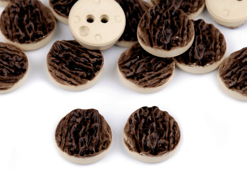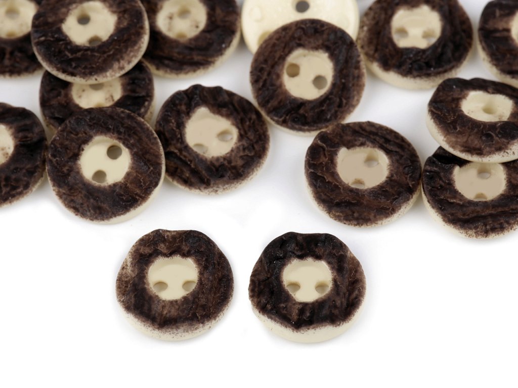 Myslivecké knoflíky svým vzhledem imitují paroží. Z přední strany jsou strukturované, zadní strana je hladká. Knoflíky jsou baleny v sáčku. Velikost knoflíků naleznete v této tabulce.- Průměr: 15 mm