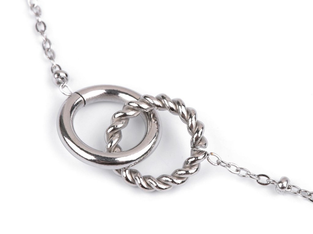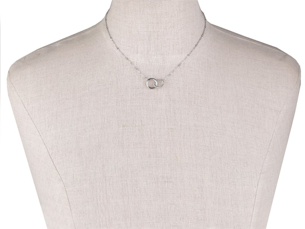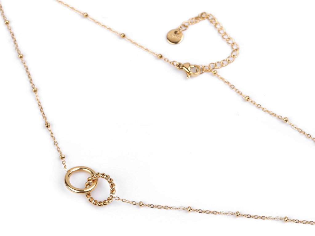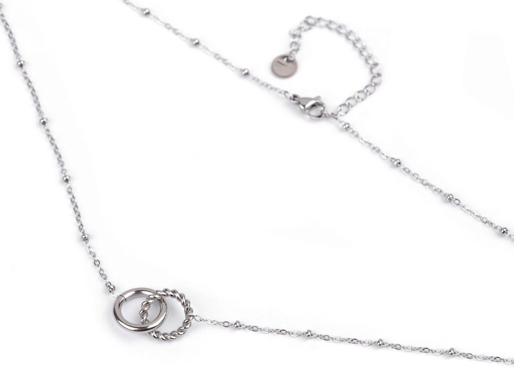 Řetízkový náhrdelník s přívěskem propojených kroužků je vyrobený z kvalitní nerezové oceli. Kroužky mají vysoký lesk, jsou umístěné uprostřed náhrdelníku. Řetízek je očkový, kombinovaný s drobnými nerezovými korálky. Náhrdelník decentně dozdobí většinu outfitů, zapíná se na karabinku s prodlužovacím řetízkem.- Délka: 40 cm