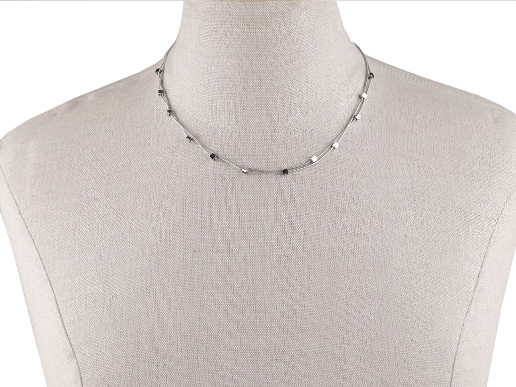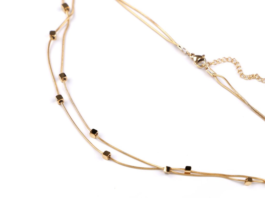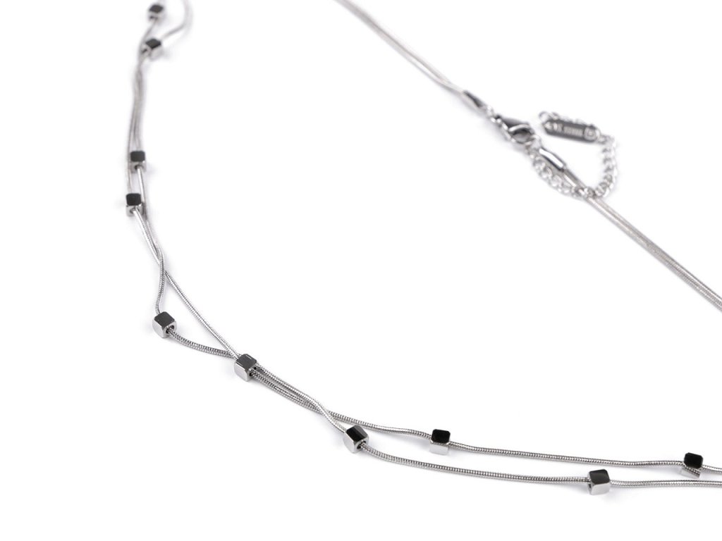Dvojitý náhrdelník s krychličkami je vyrobený z kvalitní nerezové oceli. Zajímavě a decentně dozdobí většinu outfitů. Krychličky mají zrcadlový lesk, na hadích řetízcích jsou pevně připojené. Náhrdelník se zapíná na karabinku s prodlužovacím řetízkem.- Délka: 42 cm